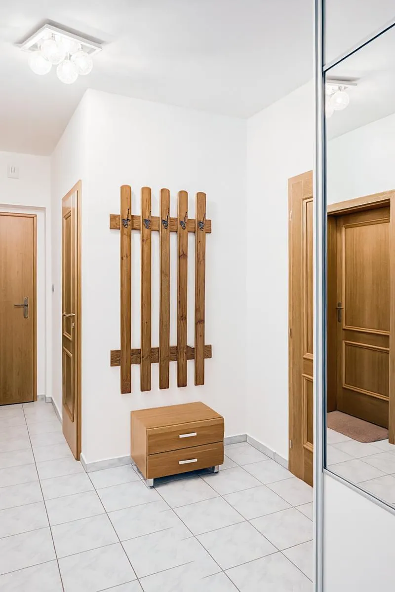 Dále byt nabízí dvě ložnice, jednu s přímým vstupem na soukromou terasu orientovanou do vnitrobloku, prostornou koupelnu s rohovou vanou a oknem, a velkou vstupní halu s vestavěnými skříněmi.