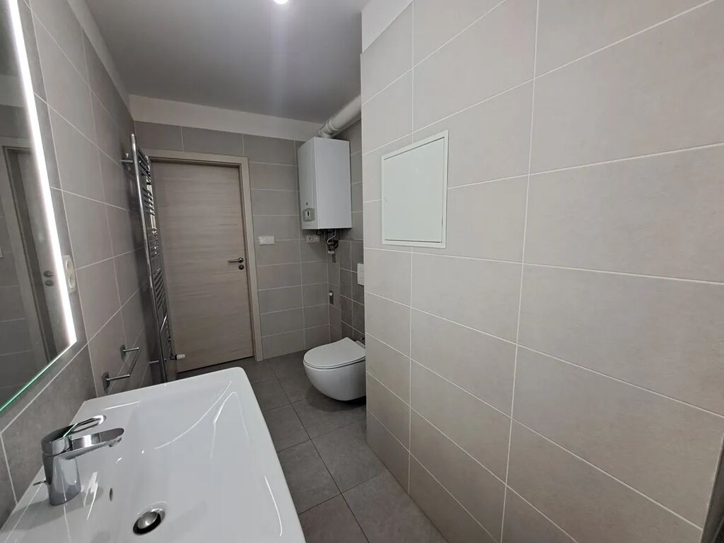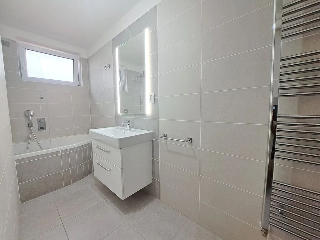 Koupelna s oknem (vana se zástěnou vč. sprchové hlavice, umyvadlo se skříňkou, připojení na pračku, zrcadlo, topný žebřík, závěsné WC, vlastní plynový kotel, větrák).
