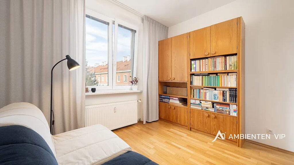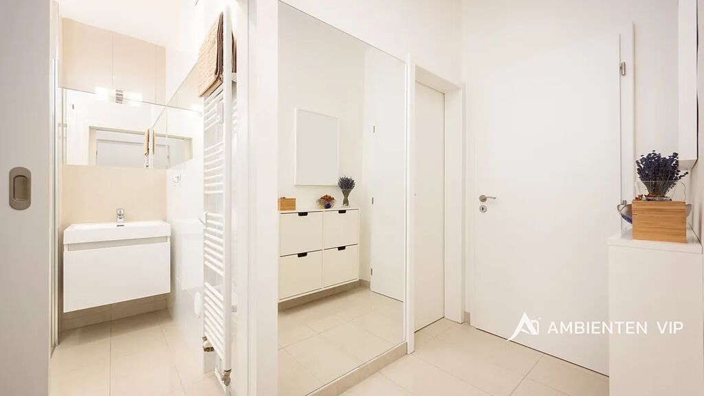 Po vstupu do bytu se ocitnete ve vstupní chodbě, z níž je přístup do obývacího pokoje, koupelny, samostatného WC/prádelny a pracovny. Z obývacího pokoje je možné vstoupit do ložnice – obě hlavní místnosti jsou orientované na jih a poskytují dostatek denního světla, zatímco pracovna je orientovaná na sever a nabízí klidné pracovní zázemí. Podlahy v obývacím pokoji, ložnici a pracovně jsou dřevěné, zatímco ve vstupní chodbě, koupelně a WC je keramická dlažba.