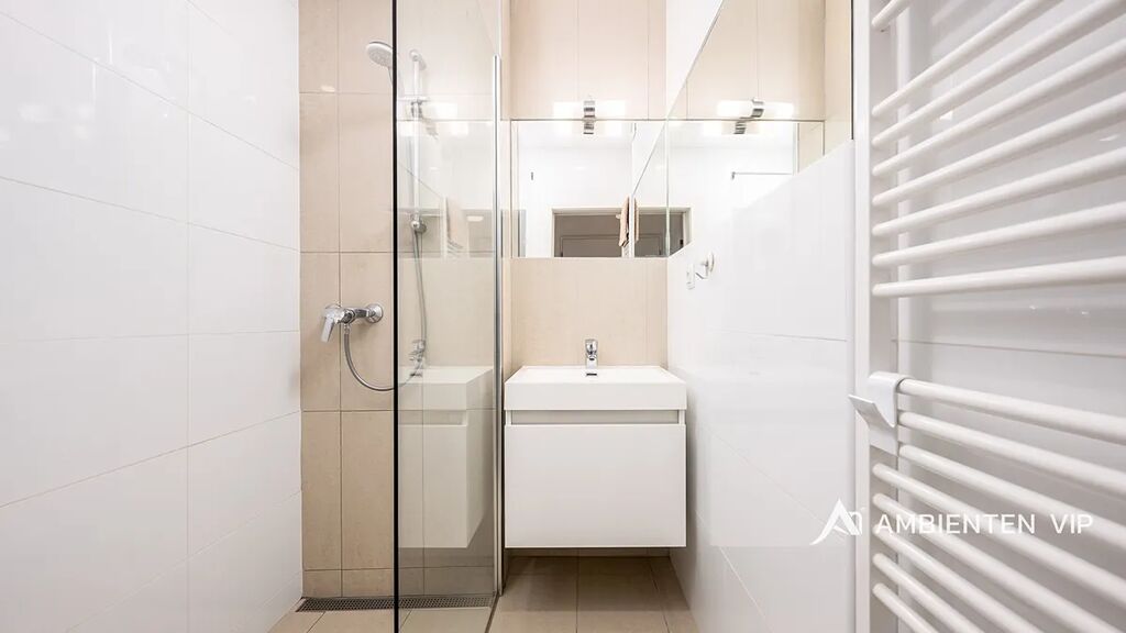 Koupelna je vybavena moderní walk-in sprchou a umyvadlem se zrcadlem. WC slouží zároveň i jako prádelna, kde je umístěna pračka, samostatné umyvadlo a zrcadlo, což zajišťuje praktické řešení prostoru.