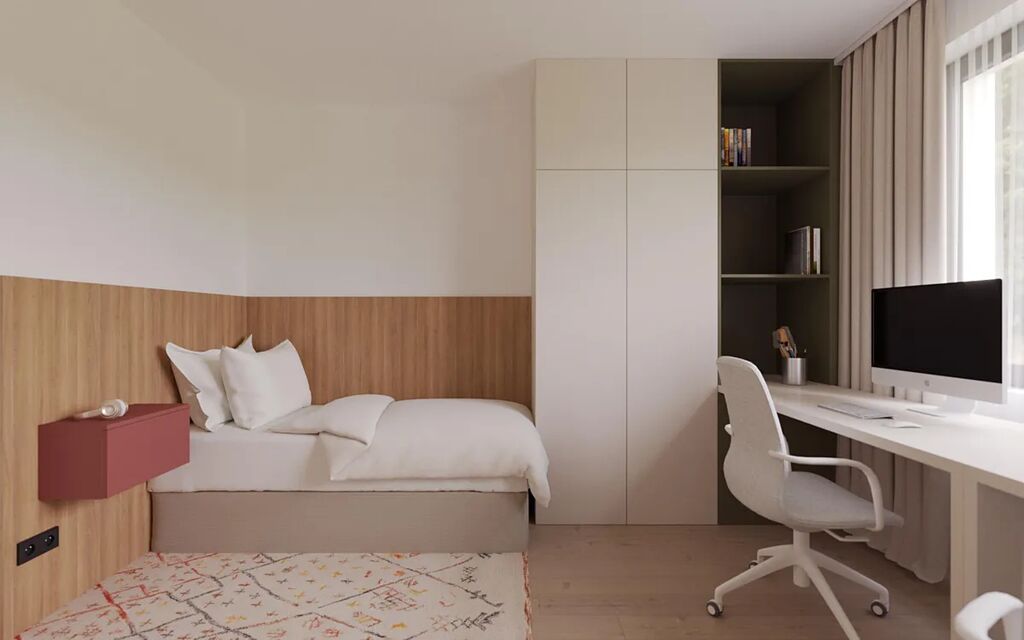 Dispozice bytu je promyšlená do posledního detailu. Dvě ložnice poskytují dostatek soukromí a klidu pro odpočinek. Prostorný obývací pokoj plynule navazuje na kuchyňský kout, což vytváří ideální prostor pro rodinný život i společenská setkání. Koupelna je vybavena vanou i sprchovým koutem, nechybí ani samostatná technická místnost s úložným prostorem. Střešní terasa nabízí výhled do okolní krajiny a představuje dokonalé místo pro relaxaci, grilování nebo večerní posezení.