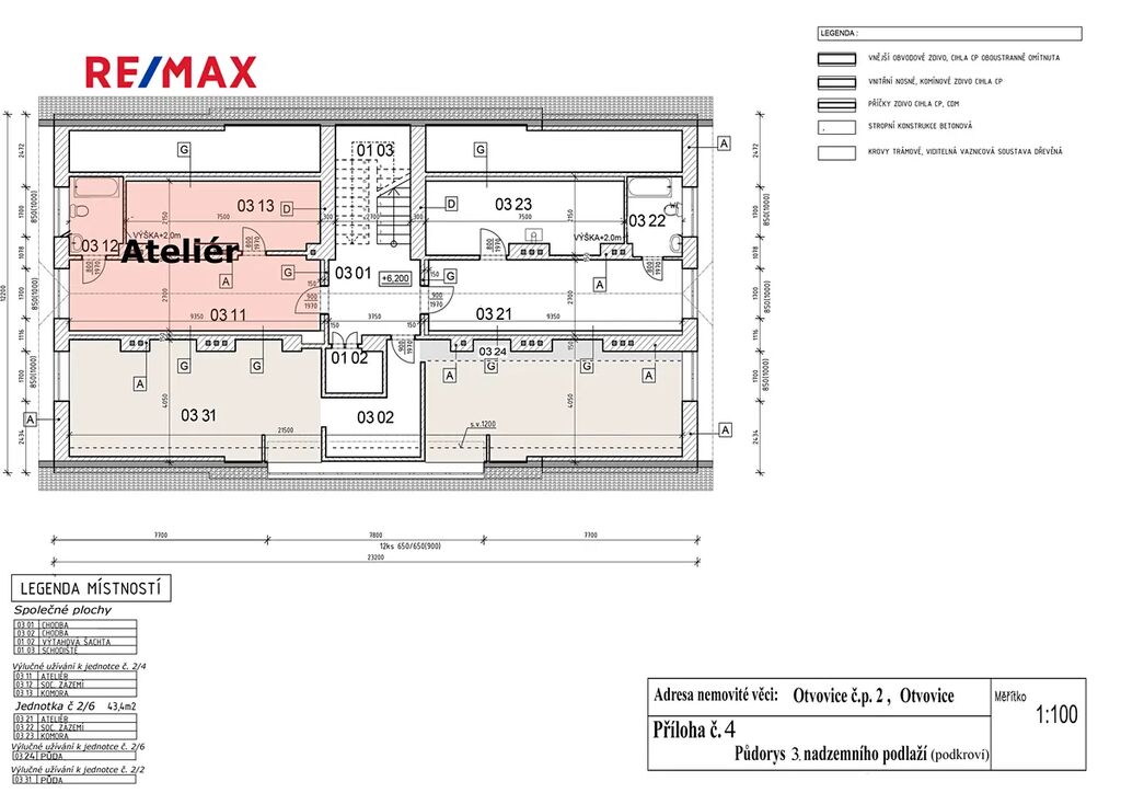 1) výlučné užívání ateliéru (ateliér č. 0311, soc. zařízení č. 0312 a komora č. 0313) umístěný v 3. nadzemním podlaží = ateliér se nachází přímo nad prodávaným bytem, možnost rekonstrukce prostor pro vlastní bytové či podnikatelské potřeby nebo následný pronájem