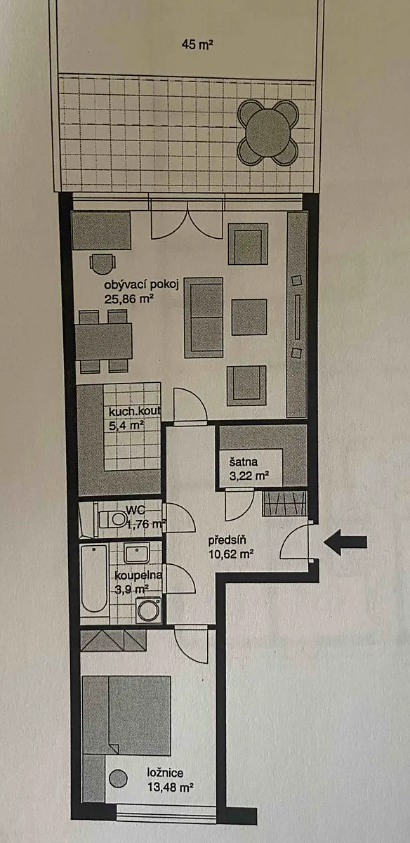 Tento světlý byt se nachází v novějším bytovém domě a jeho největší klenot – prostorná terasa o úctyhodných 45 m² – vás zve k ranní kávě s výhledem, večernímu grilování s přáteli nebo jednoduše k nerušenému odpočinku pod širým nebem. K bytu navíc patří praktický sklep (2,4 m²), který pojme vše, co potřebujete mít po ruce, ale zároveň mimo dohled.