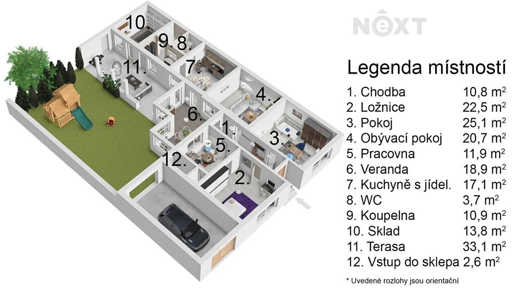 K dispozici je chodba (10,8 m2), obývací pokoj (20,7 m2), pracovna (11,9 m2), kuchyně s jídelnou (17,1 m2), ložnice (22,5 m2), pokoj (25,1 m2), veranda s výhledem do zahrady (18,9 m2), WC (3,7 m2), koupelna (10,9 m2), sklad (13,8 m2), terasa (33,1 m2), vstup do sklepa (2,6 m2).