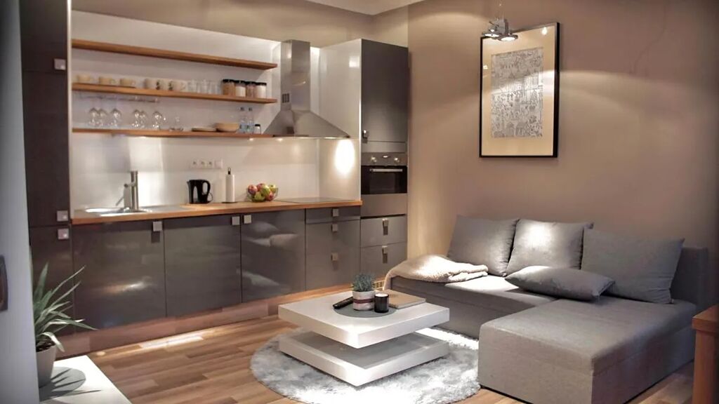 Byt disponuje prostorným obývacím pokojem s kuchyňským koutem, jednou samostatnou ložnicí a koupelnou se sprchovým koutem. Kuchyně je plně vybavená moderními spotřebiči, včetně myčky, lednice a trouby. V obývacím pokoji jsou velká okna, která zajišťují dostatek přirozeného světla a vytvářejí příjemnou atmosféru.