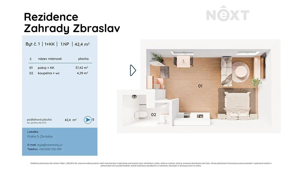 Nemovitost disponuje 42,5 m2 podlahové plochy a nachází se na 1.NP menšího domu. Sestává se z hlavní obytné místnosti a koupelny. Jednotka prošla rozsáhlou rekonstrukcí, kdy byly vyměněny rozvody elektřiny, vody. Dále byla rekonstruována koupelna. Okna jsou plastová dvojskla s argonovou výplní a dobře izolují hluk z ulice. Topení zajišťují elektrické přímotopy. Na podlahu byl položen vinyl. V hlavním pokoji je příprava na kuchyň a dostatečné množství elektrických zásuvek. Jednotka má samostatný elektroměr. K jednotce je také možné přikoupit parkovací stání.