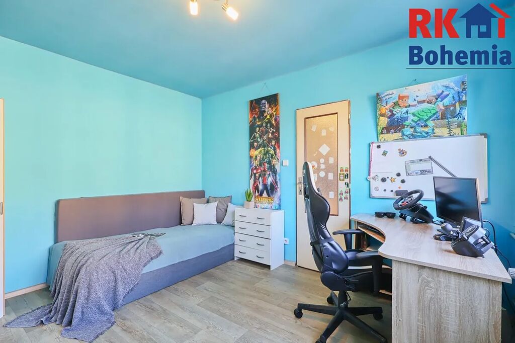 Byt se skládá z obývacího pokoje (17 m2), ložnice (13,30 m2), dětského pokoje (12 m2), kuchyně (8,20 m2), koupelny s vanou a umyvadlem (2,9 m2), samostatného WC (0,94 m2), prostorné předsíně (8,94 m2) a zasklené lodžie (3,89 m2). K bytu náleží sklep (1,26 m2), a komora na patře (2,9 m2).
