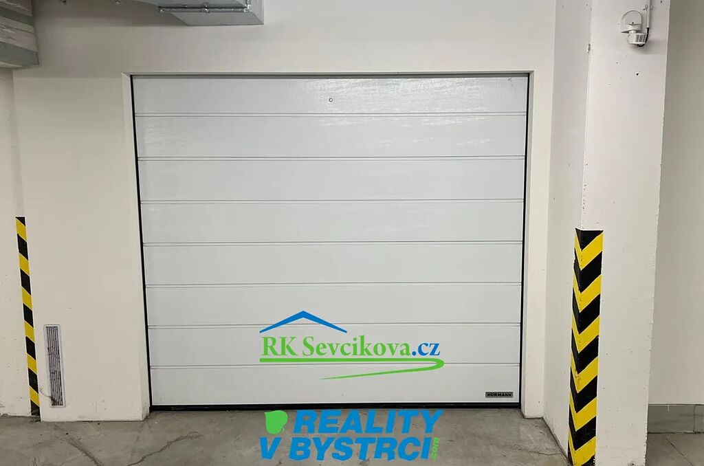 Objekt garáží zabezpečen automatickými garážovými vraty na dálkové ovládání. Garáž se nachází za dalšími garážovými vraty.