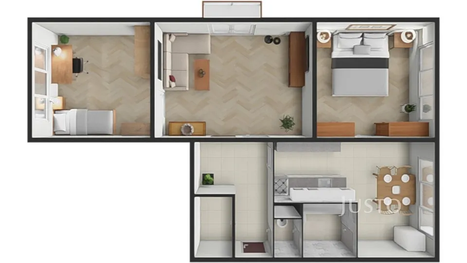 dobře řešená dispozice 3+1, šatna a úložné prostory v chodbě,