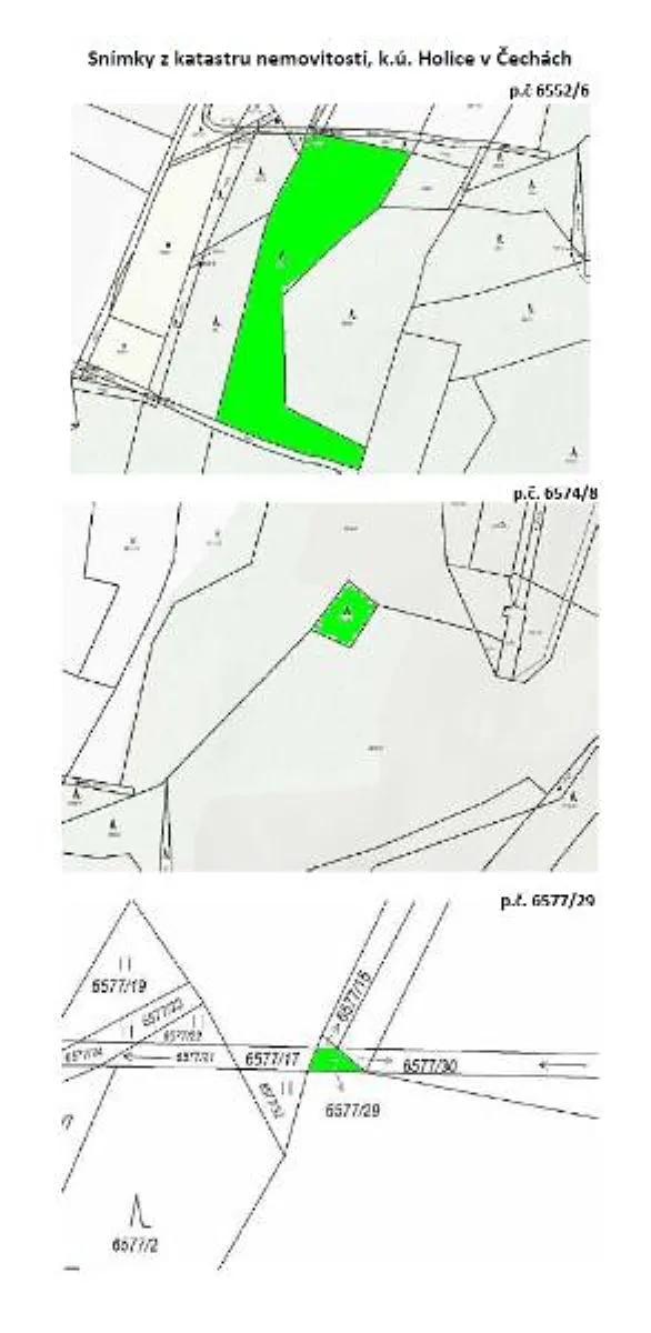 p.č. 6552/6 v k.ú. Holice v Čechách je obklopen pozemky soukromých vlastníků a pozemkem ve vlastnictví Města Holice. Na pozemku se nachází lesní porost borovice lesní přibližného stáří 30 let. Pozemek ve svém jihovýchodním cípu plochou cca 300 m2 zasahuje do chráněného ložiskového území CHLÚ 05470000 Ostřetín a výhradního ložiska cihlářské suroviny B3 054700 Holice. Ochranou a evidencí ložiska je pověřena organizace Wienerberger s.r.o. Pozemek p.č. 6577/29 - vodní plocha se nachází mezi zemědělsky obhospodařovanými pozemky (p.č. 6577/18, p.č. 6577/45 a další) a lesním pozemkem p.č. 6552/6. Pozemek tvoří část příkopu pro odvod povrchových a dešťových vod.