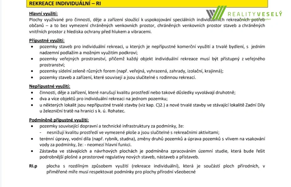 Na pozemku je dle územního plánu možné postavit rekreační objekt o jednom nadzemním podlaží s obytným podkrovím, maximální zastavěná plocha 50 m² – vhodné pro chatu, zahradní domek nebo menší rodinné zázemí pro víkendový pobyt nebo celoroční bydlení .