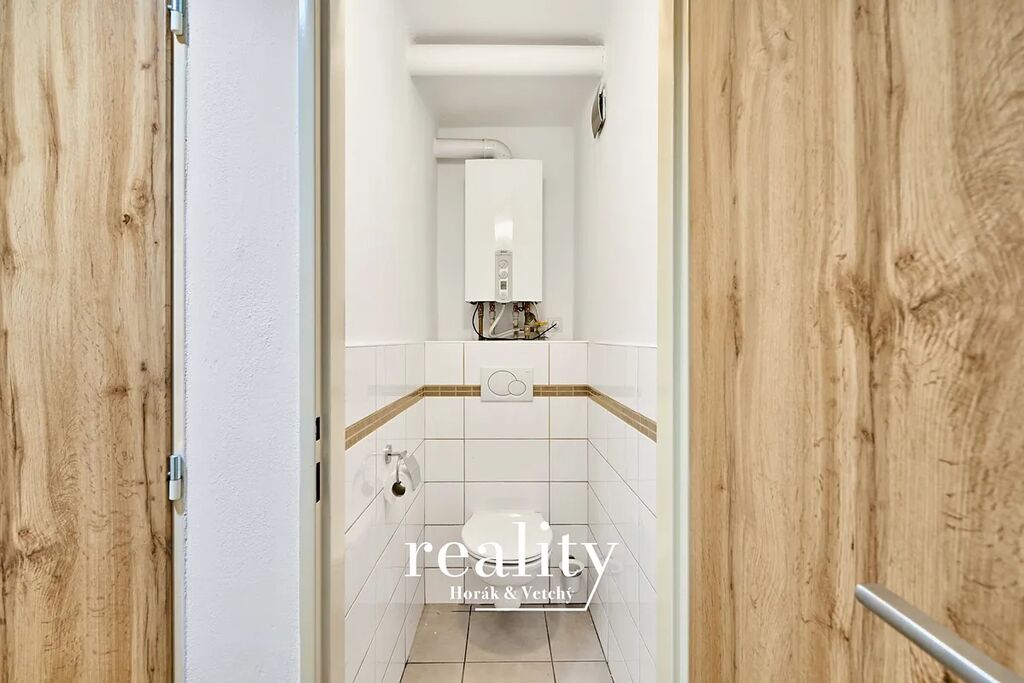 Při vstupu je na pravé straně prostorná šatna k uložení sezónních věcí, dále samostatné WC, koupelna vybavena vanou a přípojkou na pračku.