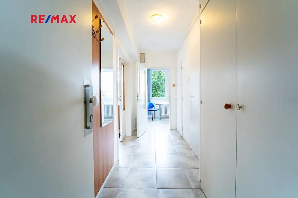 Bytová jednotka 1+1, po rekonstrukci (elektřina, odpady), se nachází ve 4. patře z 12 pater s výhledem do zeleně (školka). Dispoziční řešení: kuchyň s jídelnou, prostorná místnost, chodba s úložným prostorem a koupelna s oddělenou toaletou.