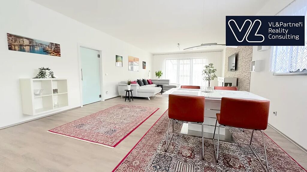 Interiér domu působí vzdušně a nadčasově. Dominantou je velkorysý obývací pokoj s přímým vstupem na terasu, který volně navazuje na moderní kuchyň s jídelní částí. Dům nabízí také tři samostatné pokoje, koupelnu s kvalitním vybavením, technickou místnost a vstupní halu. Vše je laděno v jednotném, elegantním stylu a vybaveno kvalitními materiály, které podtrhují celkový dojem luxusu.