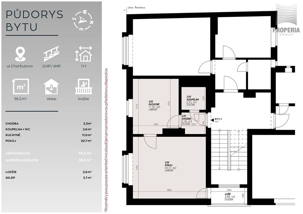 Díky tomu nabízí byt moderní standard a pohodlí, na které se můžete ihned spolehnout. Má praktické dispoziční řešení – centrální chodba zajišťuje samostatné vstupy do koupelny a kuchyně, ze které vstoupíte do pokoje orientovaného na jih do zeleného parku. Pokoj disponuje vstupem na východně orientovanou lodžii o ploše 2,6 m². K bytu náleží sklep o velikosti 3,7 m².