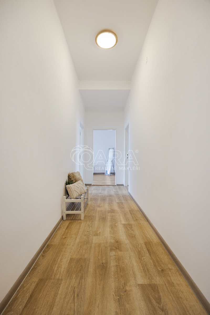 Podlahy v pokojích zdobí zachovalé parkety – jejich renovací můžete interiéru dodat moderní vzhled a styl. V ostatních částech bytu je na podlaze praktické lino. Součástí bytu je také prostorný sklep, ideální pro uskladnění věcí.