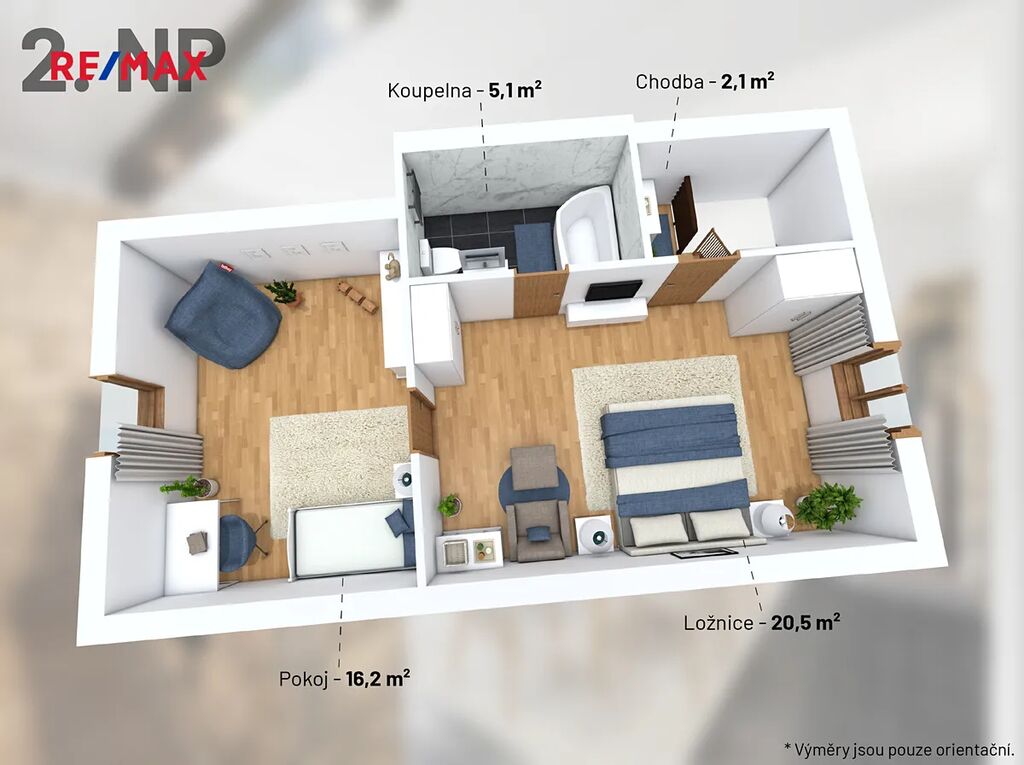 2.NP – pokoj 16,2m2, pokoj 20,5 m2, koupelna 5,1 m2, chodba 2,1 m2