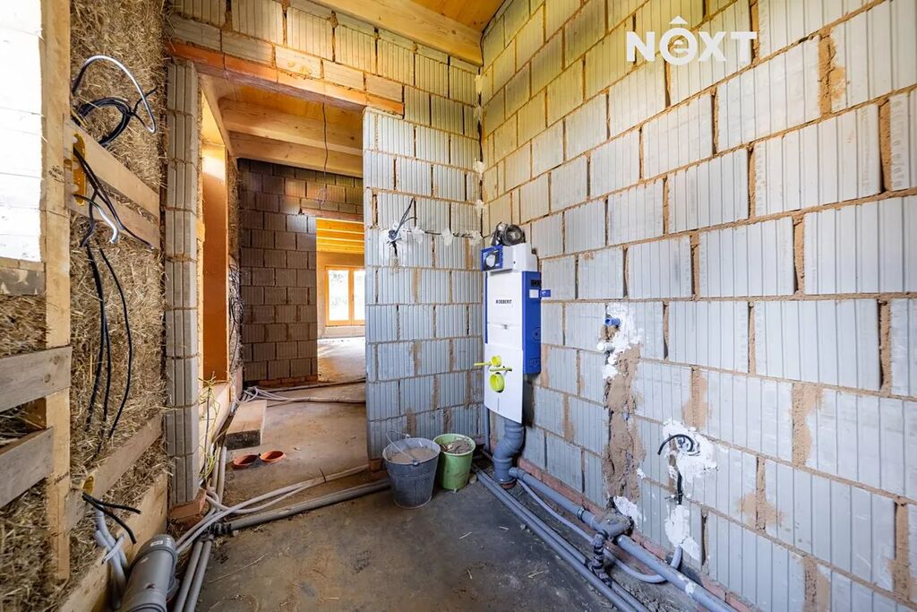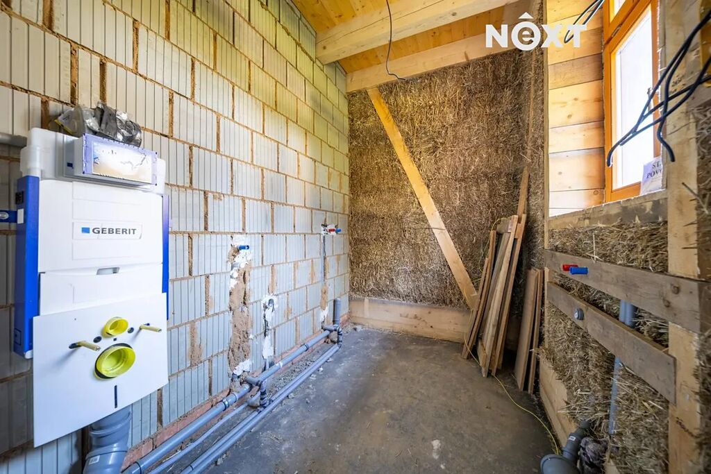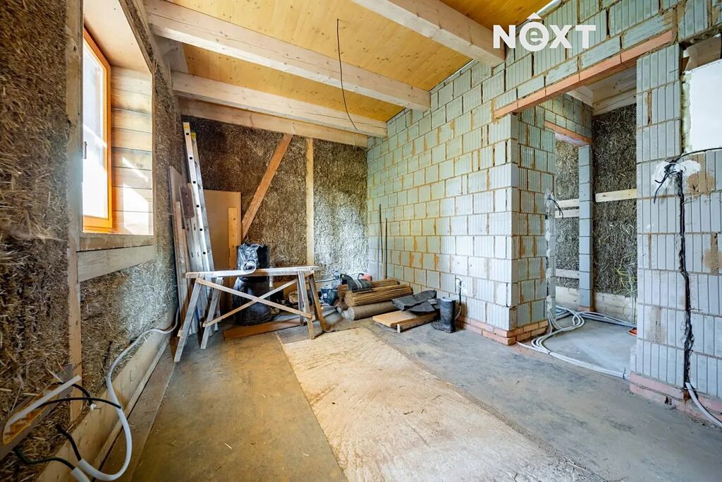 Z pohledu exteriéru chybí dodělat fasádu, terasy, schody a chodníčky a napojit si dům na sítě. V domě jsou elektroinstalace, voda a odpady dokončené. Co se interiéru týče je třeba dodělat část omítek, kompletní podlahy, dveře, zárubně, sanitu v koupelně, kotel na vytápění, schodiště a obytné podkroví (3 pokoje). Celkový rozpočet na dokončení domu včetně napojení na sítě je cca CZK 1.5 MIO. Majitelka nabízí možnost propojení s profesionální firmou, která s těmito výjimečnými stavebními materiály a technologiemi umí pracovat. Některé materiály na dokončení domu se nachází na místě a jsou v ceně domu (parapety i obklad soklu, zateplení podkroví apod.). Základy domu jsou robustní (hloubka až 1,7 m) a doplněny profesionální drenáží, která zajišťuje suchý a stabilní pozemek. Dům je připraven k napojení na sítě, součástí prodeje je projekt na čističku, (cca CZK 100.000,-), elektřina je na hranici pozemku, vodu je nutno řešit kopanou studnou (voda je přibližně v hloubce 4-7 m). Majitelka má projekt se stavebním povolením na kopanou studnu v celkových nákladech cca 100.000,-).
