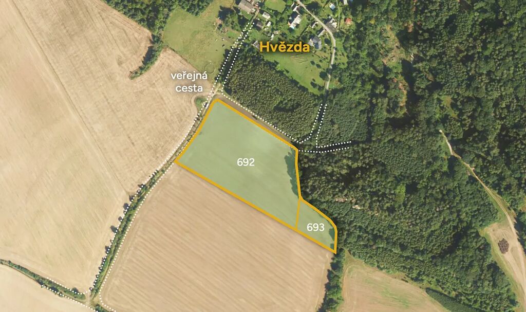 Nabízím k prodeji soubor zemědělských pozemků v katastrálním území Hvězda pod Vlhoštěm, vedených na listu vlastnictví č. 319. Jedná se o výlučné vlastnictví, tedy prodej 100% podílu. Pozemky se nacházejí na parcelních číslech 692 a 693 a jejich celková výměra činí 28 865 m².