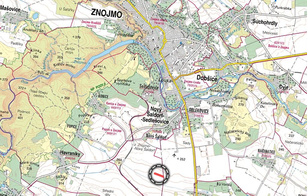 Pozemek leží u cesty jižně od obce a nachází se v úrodné krajině znojemského regionu, která je známá svou vysokou kvalitou zemědělské půdy. Bonita pozemku dosahuje hodnoty 16,77 Kč/m², což odpovídá prémiové bonitě v rámci tohoto katastru.
