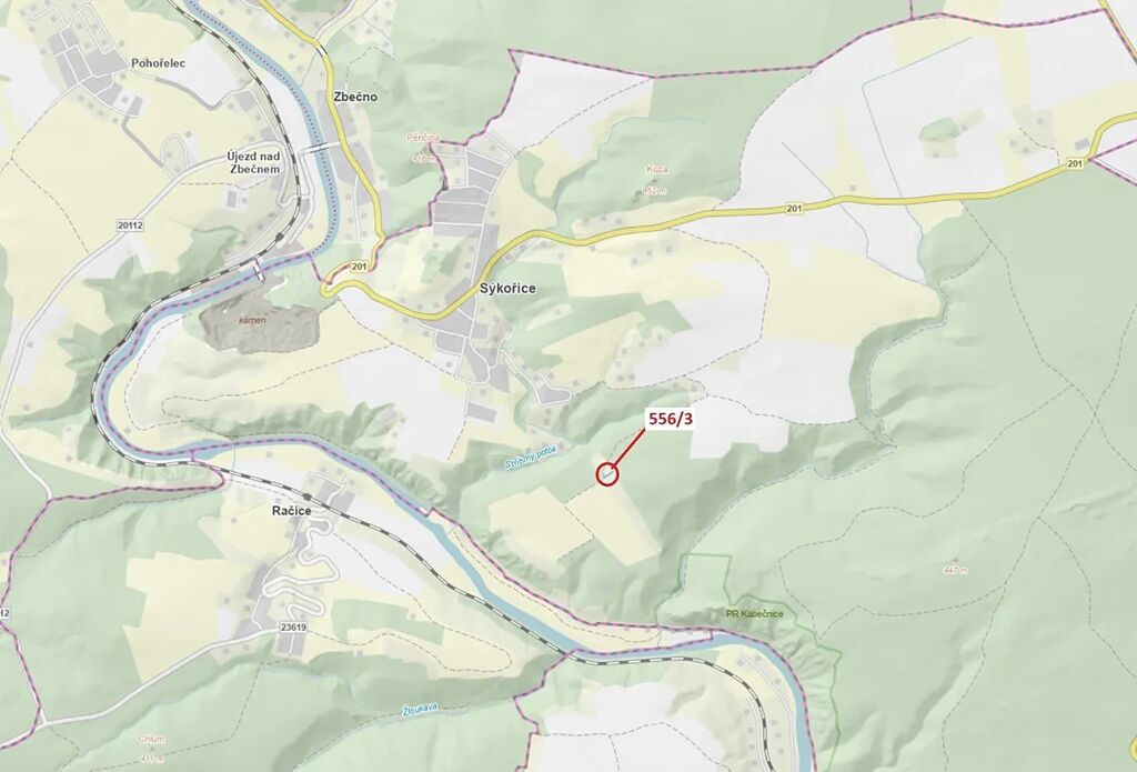 Lesní pozemek o výměře 326 m2, parcelní číslo 556/3, podíl 1/1, katastrální území Sýkořice, obec Sýkořice, obec s rozšířenou působností Rakovník, okres Rakovník, Středočeský kraj.