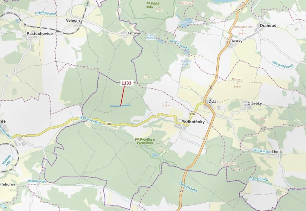 Lesní pozemek o výměře 7 895 m2, parcelní číslo 1133, podíl 1/1, katastrální území Podbořánky, obec Jesenice, obec s rozšířenou působností Rakovník, okres Rakovník, Středočeský kraj. Částečně po těžbě.