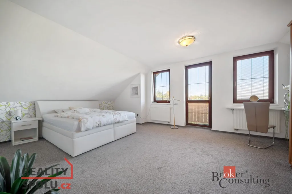V patře jsou čtyři samostatné pokoje, z nichž jeden je využíván jako šatna (s vestavěnou skříní po celé délce). Dále je zde druhá koupelna s vanou a samostatná toaleta. Hlavní ložnice je vybavena klimatizací.