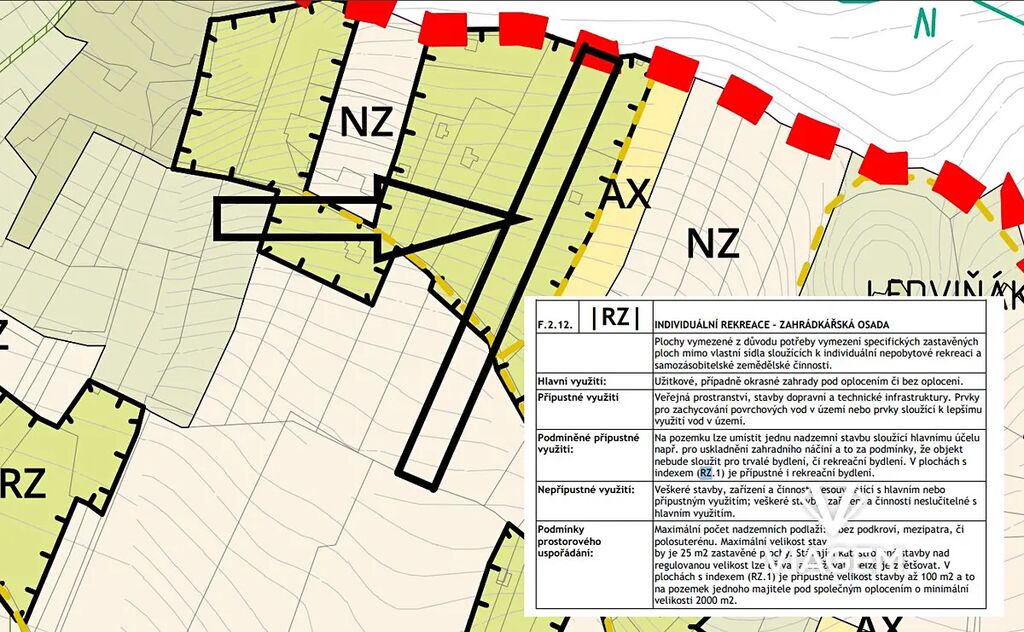 Územní plán: pozemek se nachází v plochách rekreace (RZ a RZ.1)
