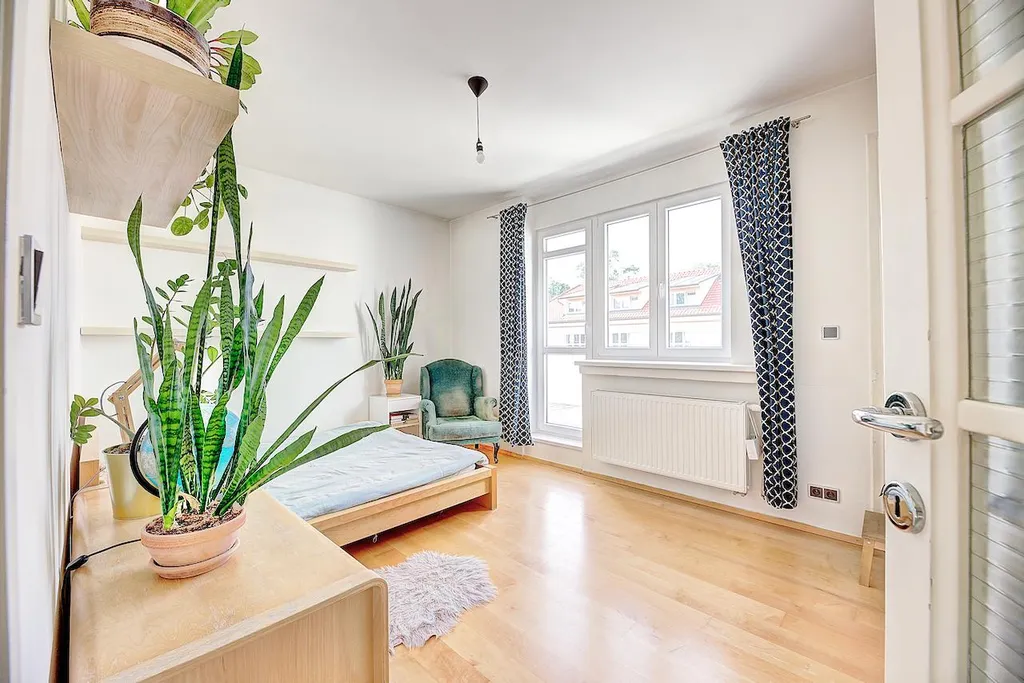 Obývací pokoj směřuje na jih do ulice Evropská, ložnice na sever do klidné ulice Mydlářka.