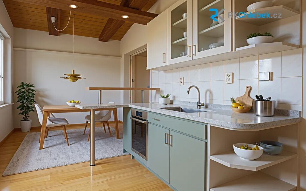 Mezipatro: prostorný obývací pokoj a kuchyně se spíží, ideální pro každodenní rodinné fungování. Zde je také přístup na střešní prostory garáže, které lze přestavět na krásnou prostornou terasu s výhledem na zeleň.
