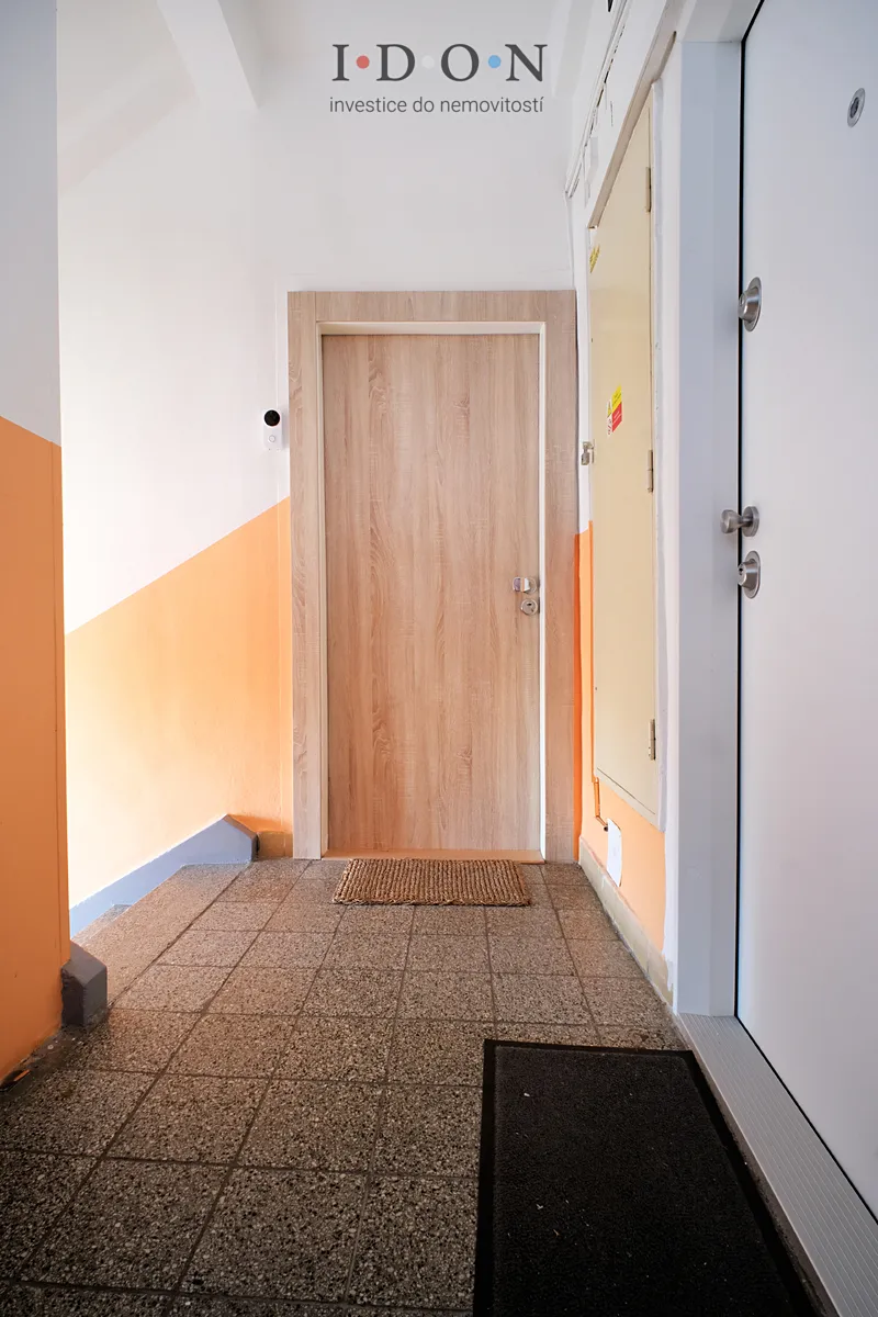 Před vstupem do bytu je instalován bezpečnostní zvonek s kamerou – obraz lze sledovat a ovládat i přes mobilní telefon, což zajišťuje vysoký komfort i bezpečí.