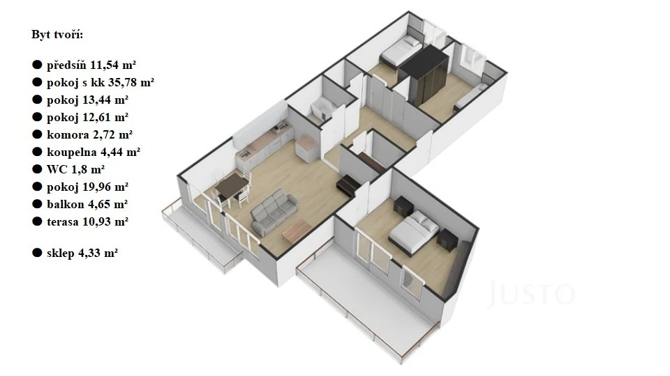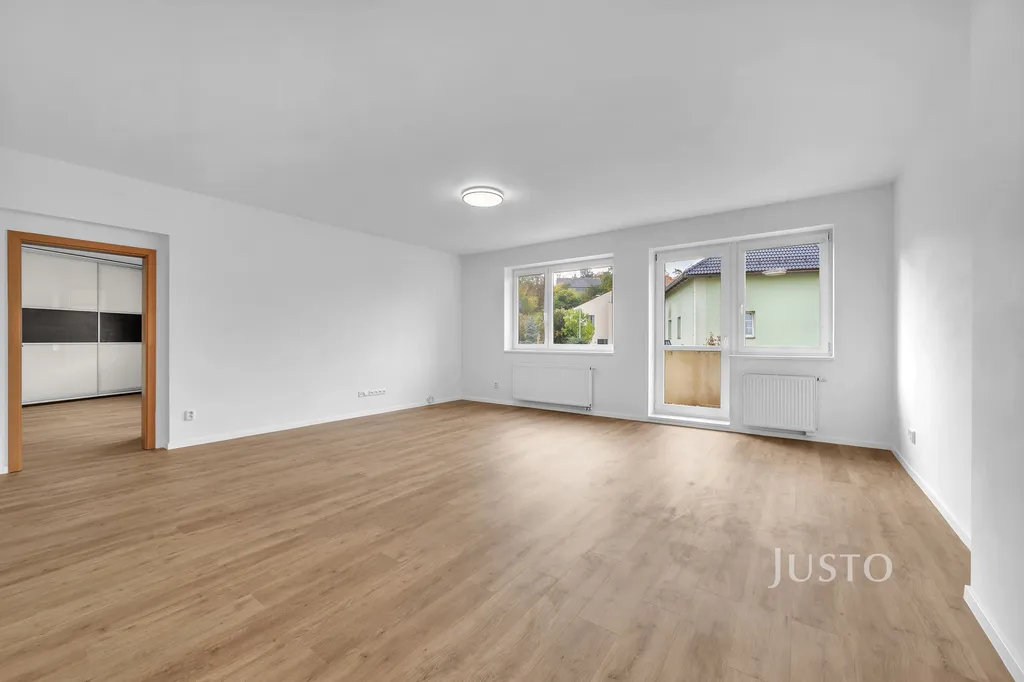 Hned po otevření dveří Vás přivítá světlý a vzdušný interiér s moderními podlahami a velkými okny, která propouští dostatek denního světla do všech místností. Byt má tři neprůchozí ložnice – ideální řešení pro rodiče i děti, které se tak mohou těšit na svůj bezpečný prostor. Obývací pokoj propojený s kuchyňským koutem, ze kterého můžete vstoupit přímo na rozlehlou terasu o ploše téměř 11 m². Tato terasa navíc nabízí dostatek místa pro rodinné snídaně, letní grilování nebo večerní posezení. Další bonus představuje útulný balkon orientovaný na jih, odkud můžete pozorovat krásy okolní zeleně.