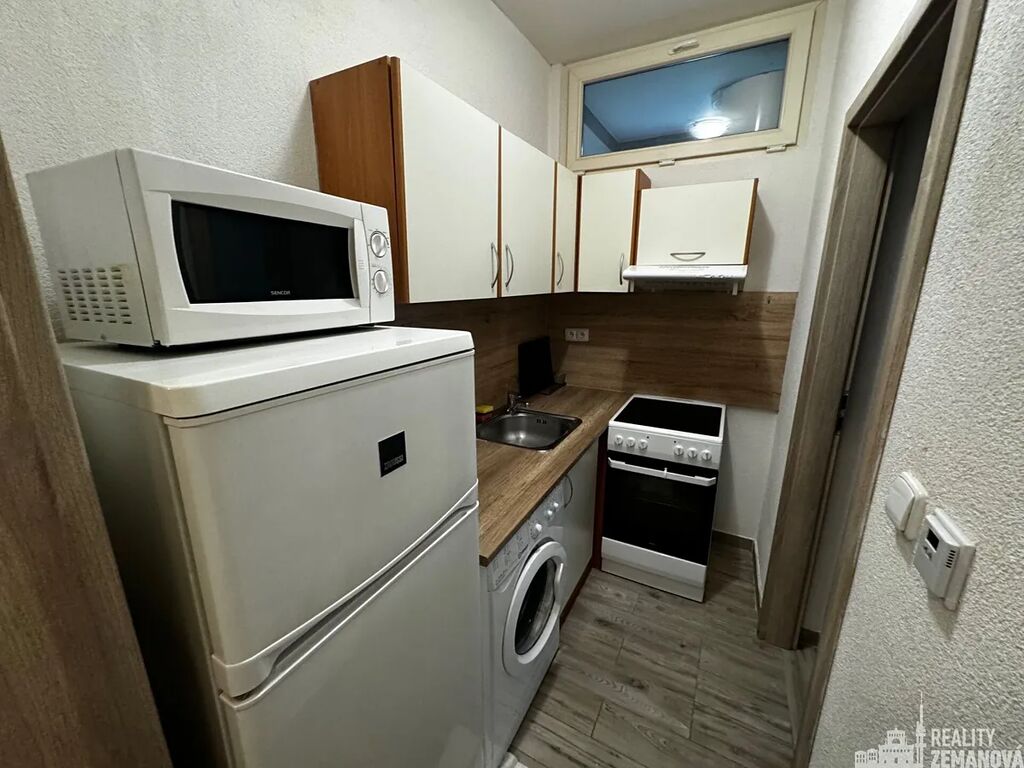 Dispozice: předsíňka, malý kuchyňský kout se sporákem, s lednicí a mrazákem, mikrovlnnou troubou a s automatickou pračkou. Dále jídelní kout propojený do obýváku, koupelna se sprchou a WC, prostorná ložnice. Celková výměra 37,8 m2.