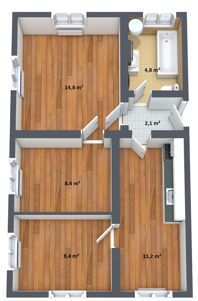 Byt se skládá ze dvou ložnic, obývacího pokoje, kuchyně, koupelny a chodby.