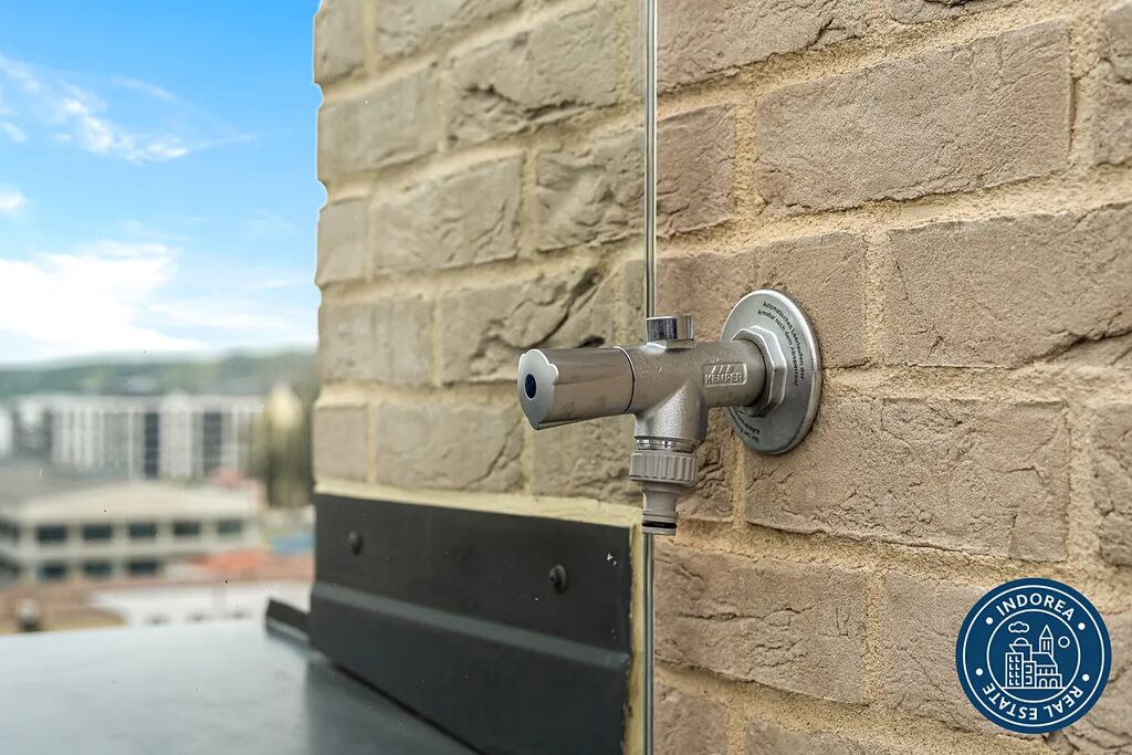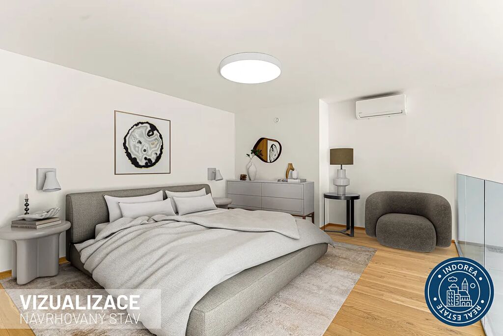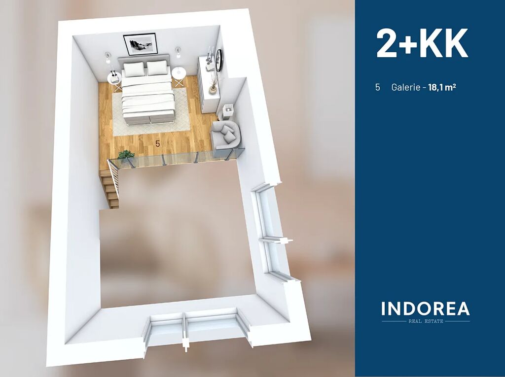 Další nespornou výhodou této jednotky jsou vysoké stropy kolem pěti metrů. Galerie má 2,4 m a tvoří tak plnohodnotný prostor nejen na spaní. Předokenní žaluzie a krásný výhled do širokého okolí novému nájemci také jistě přijdou vhod.