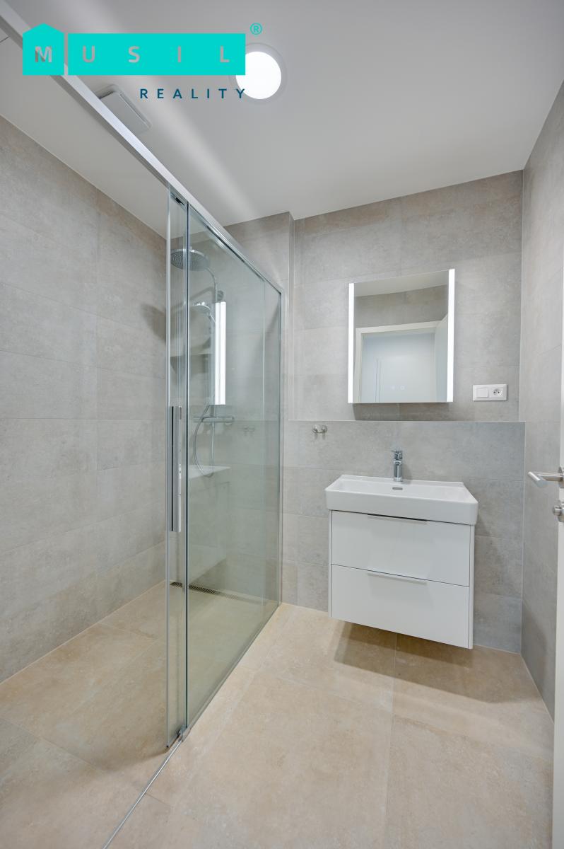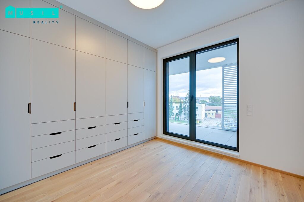 Soukromí nabízí také prostorná zastřešená lodžie (14 m2), na kterou lze vstoupit z obou pokojů, je vybavena posuvnými panely a 2 el. zásuvkami., dále následuje ložnice s praktickou vestavnou skříní, koupelna se sprchovým koutem a umyvadlem, samostatné WC s bidetovou sprškou a promyšleným úložným prostorem s policemi na míru. Samostatná komora nabídne možnost zařízení technické místnosti pro umístění pračky a sušičky.