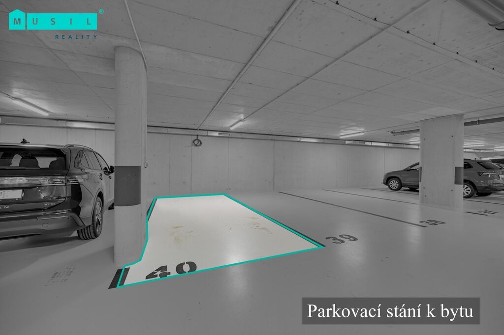 Dále je k dispozici za příplatek parkovací stání v suterénu domu, s přípravou na nabíjení pro elektro auto, dostupné výtahem a v blízkosti sklepa, náležícímu k bytu, vjezd možný na SPZ.
