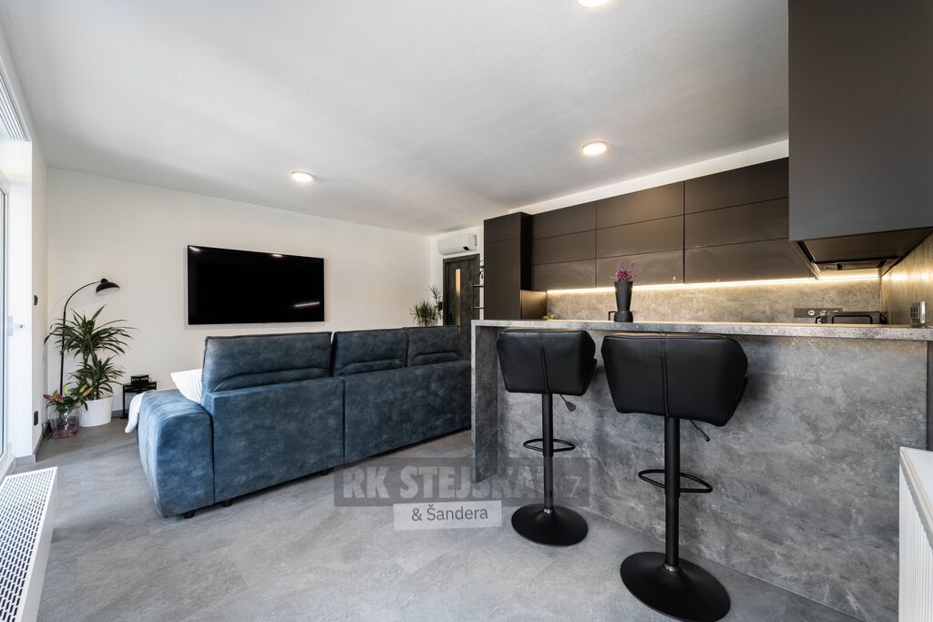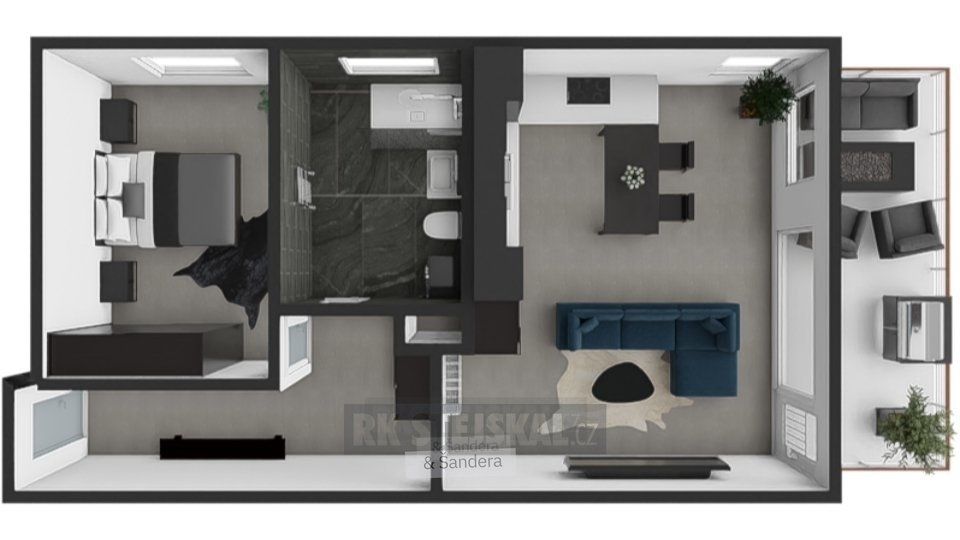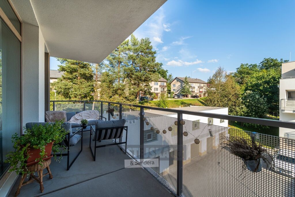 Celý byt je zakázkově a nadstandardně vybavený a veškeré vybavení bytu je součástí nájmu, což vám zajistí maximální komfort. Při vstupu do bytu vstoupíte do prostorné předsíně, která je vybavena vestavěnou skříní, věšáky a botníkem, tudíž o úložný prostor zde rozhodně není nouze. Z chodby se dostanete do prostorné ložnice, která je taktéž vybavena úložným prostorem a najdete zde robustní postel. Koupelna je zařízena v nejvyšším standardu a je stylově lazena velkoformátovým obkladem do tmavé barvy. Dominantou je poté prostorný obývací pokoj spojený se zakázkovou kuchyňskou linkou do tvaru U, která je vybavena vestavěnými spotřebiči a nadchne každého milovníka vaření. I obývací pokoj je stylově vybaven a najdete tu polohovatelnou sedací soupravu a další úložné prostory. Obývací pokoj je propojen s rozlehlou terasou, která vám poskytne příjemné prostory pro posezení s přáteli s výhledem na Zámecký park. Byt je opatřen klimatizací a izolačními trojskly, což vám zaručí maximální komfort za každého počasí. Součástí bytu je také sklep pro pohodlné uskladnění vybavení.