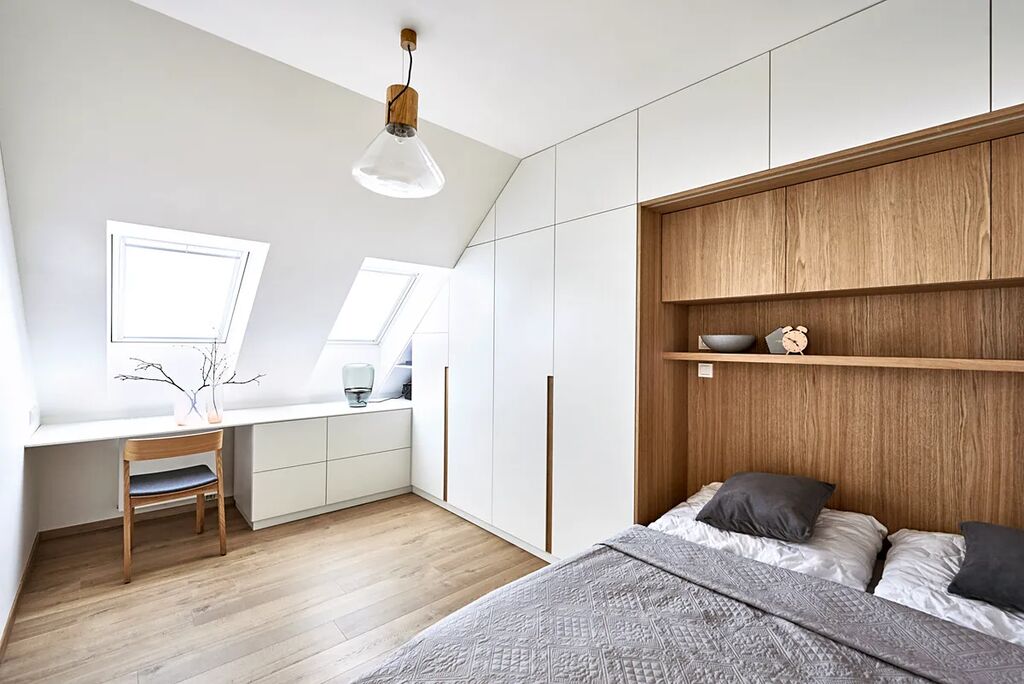 Půdní jednotka je řešena jako 2kk o celkové podlahové ploše 45m2 a je vybavena velmi důmyslným systémem vestavných skříní a truhlářských prvků tak, aby byl prostor maximálně využit. Vše ve vysokém standardu s matně lakovanými povrchy dvířek. Součástí jednotky je i užitečná sklepní koje. Byt je vybaven klimatizační jednotkou, která se postará a komfortní chlazení.