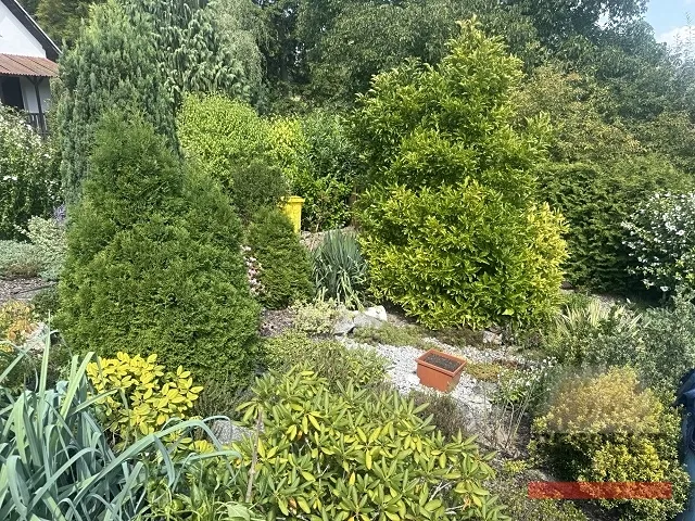 Zahrada je perfektně udržovaná, s okrasnými keři, trvalkami, zeleninovými a ovocnými záhony a spoustou nádherných zákoutí. Je oplocená kvalitním drátěným plotem, vjezd na pozemek je zajištěn dvoukřídlými vraty.