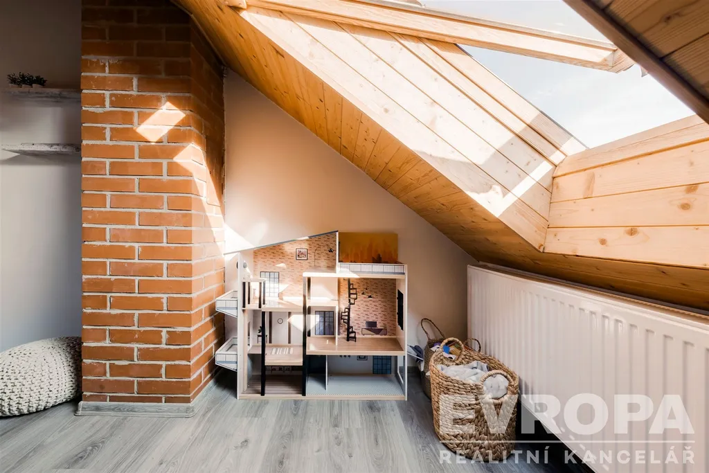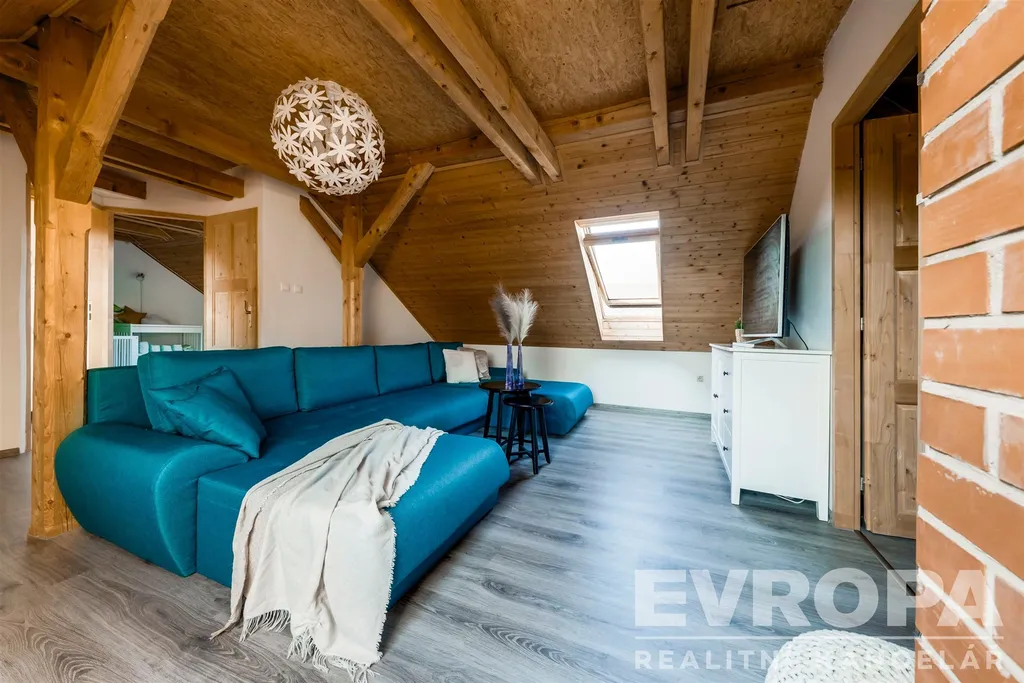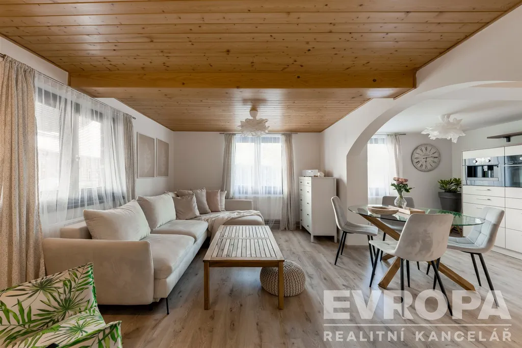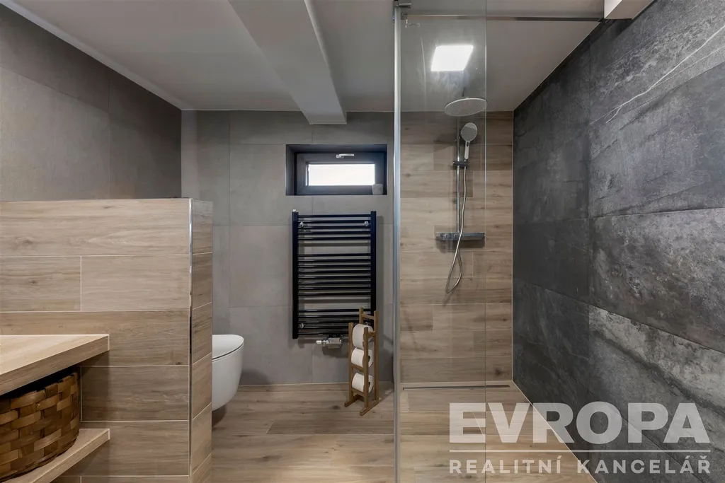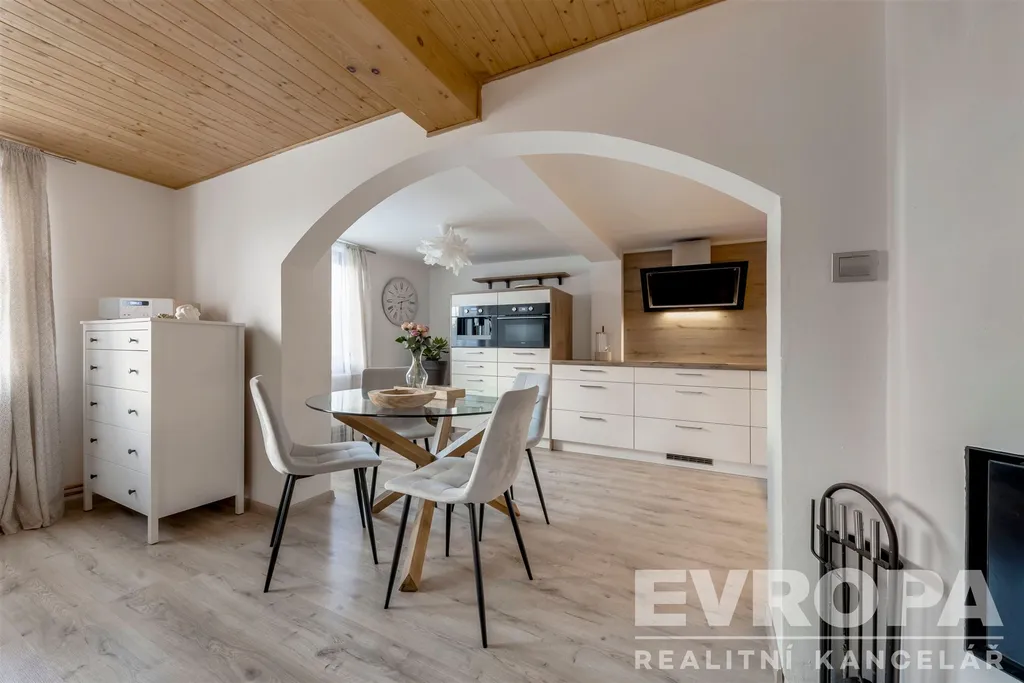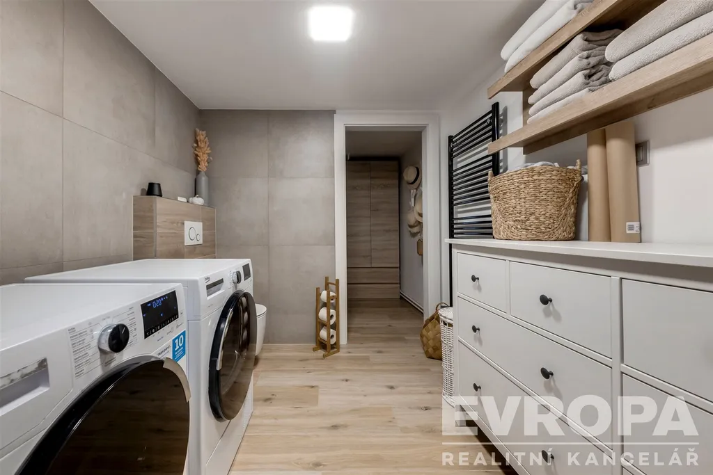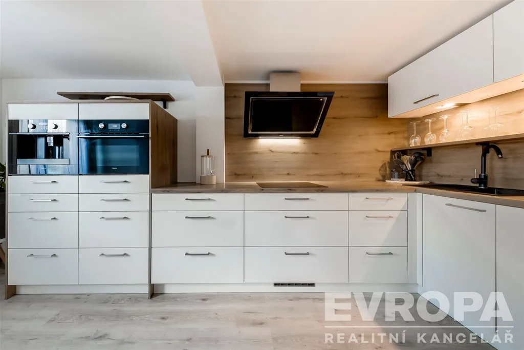 Interiér je dokonalým propojením dřeva, doplněné o designovou dlažbu, luxusní spotřebiče a hlavně je zde na každém kroku cítit otisk vkusného a praktického využití každého koutu.