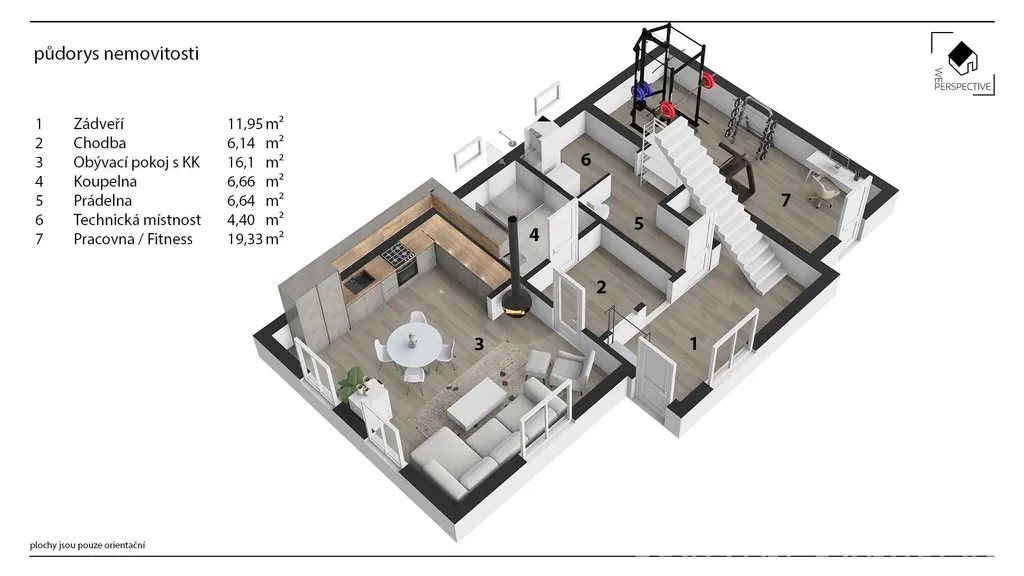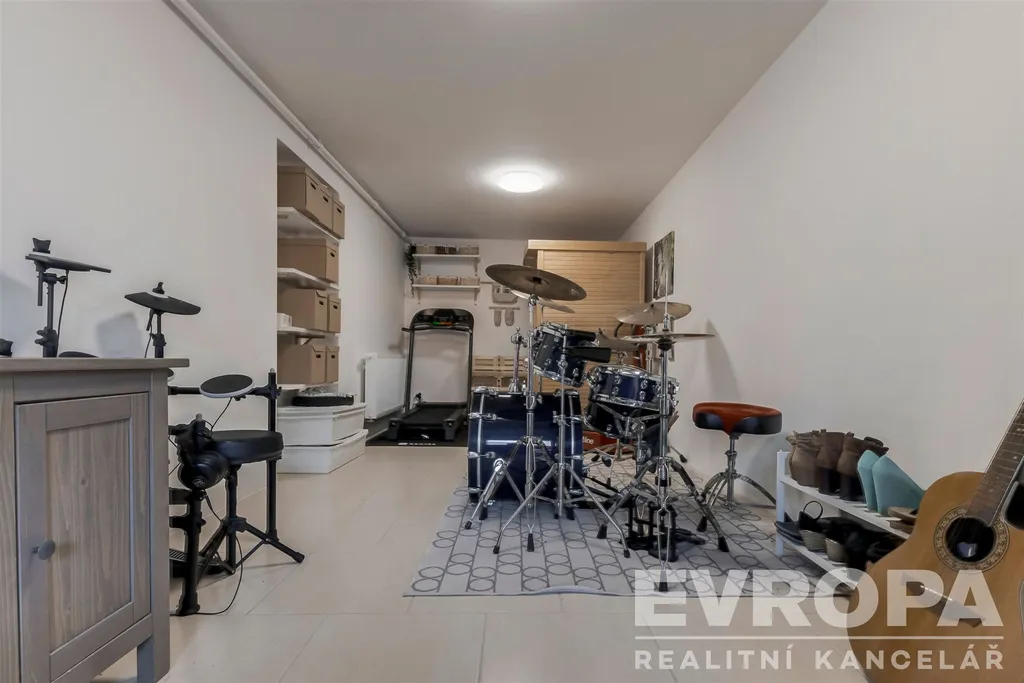 Přízemí je dělené na zádveří a předsíň, obývací pokoj s krbovou vložkou, vybavený kuchyňský kout s lux. vestavěnými spotřebiči, koupelnu se sprchovým koutem a prádelnou s toaletou a tech. místnost se šatnou. Původní garáž je využívaná jako klidová zóna ve které se nachází infrasauna a mini fitness, vstup ze zahrady. Na zahradě krásná krytá pergola, zahradní domek ........