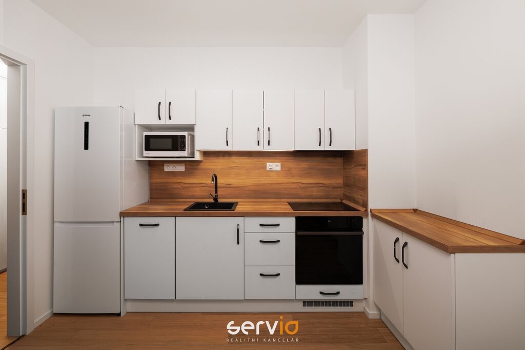 Součástí pronájmu je nová kuchyňská linka na míru se zabudovanými spotřebiči (lednička, myčka, trouba, mikrovlnka).