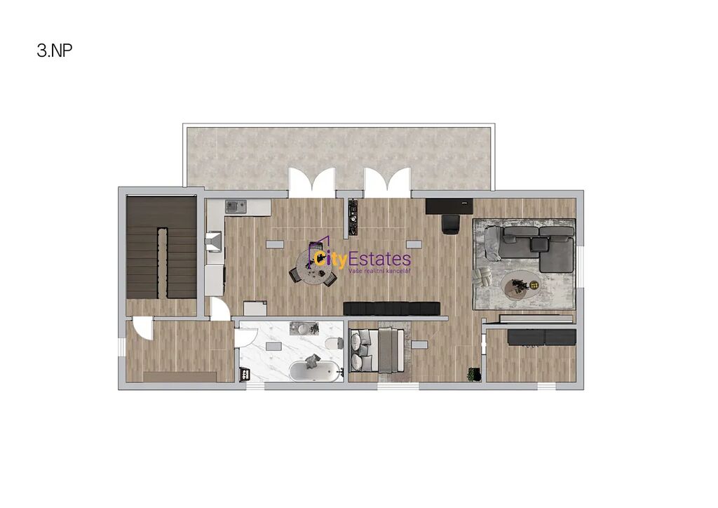 Případně z hlediska investora, který hledá více než jeden byt, ideálně vlastní dům s několika jednotkami k pronajímání, by bylo možné nemovitost rozdělit například tak jak je naznačeno v přiložených pláncích. T.j. na jednotky o velikostech 3.NP 67,9m2 + 22,4m2 terasa, 2.NP 46,7m2 + 25,2m2 terasa, 32,7m2 + 41,8m2 terasa, 1NP 27,6m2, 25,6m2, 56,5m2 + 20m2 předzahrádka, 37,8m2 garáž, tj. celkem 257 m2 + 89,4m2 terasy + 20m2 předzahrádka + 37,8m2 garáž.