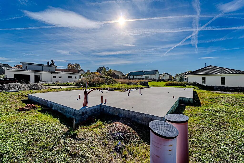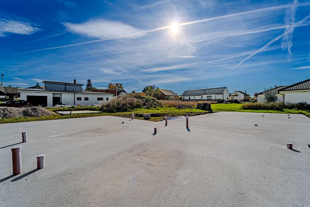 K dispozici je již hotová základová deska pro dům i garáž, opěrná zeď pro budoucí oplocení a projektová dokumentace se stavebním povolením - můžete tedy začít stavět prakticky okamžitě.