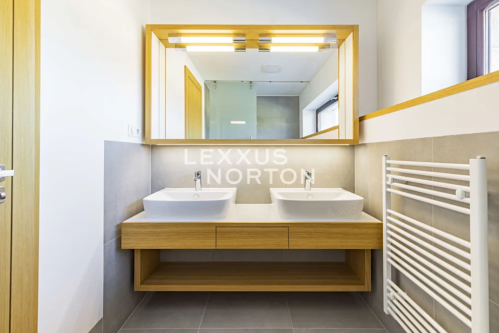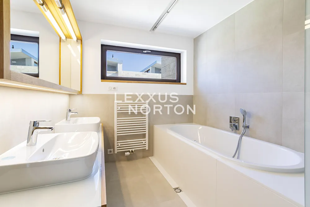 K prodeji nabízíme výjimečnou rodinnou řadovou vilu 6+kk s celkovou podlahovou plochou 304 m² a dvěma parkovacími stáními v podzemních garážích. Tento promyšleně navržený dům je ideální pro rodiny hledající maximální komfort a flexibilitu prostoru. Přízemí domu nabízí velkorysý obývací prostor s přípravou pro kuchyňský kout (63 m²) s přímým výstupem na terasu s výhledem do zeleně přilehlého lesoparku. V přízemí je dále k dispozici pokoj pro hosty s vlastní koupelnou a toaletou, který může sloužit také jako pracovna. První patro disponuje hlavní ložnicí 21 m² s vlastní koupelnou a šatnou, 2 prostornými ložnicemi (18,5 m², 19,5 m²) a další samostatnou koupelnou se sprchou a vanou. Korunou domu je krásná střešní terasa 74 m² s výhledy do okolní zástavby a zeleně, kterou lze při zastřešení využívat téměř celoročně.