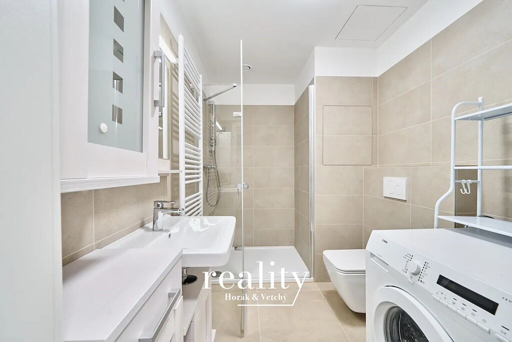 V koupelně se nachází prosklený sprchový kout, umyvadlo se skříňkami, WC a pračka.