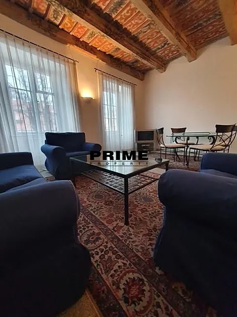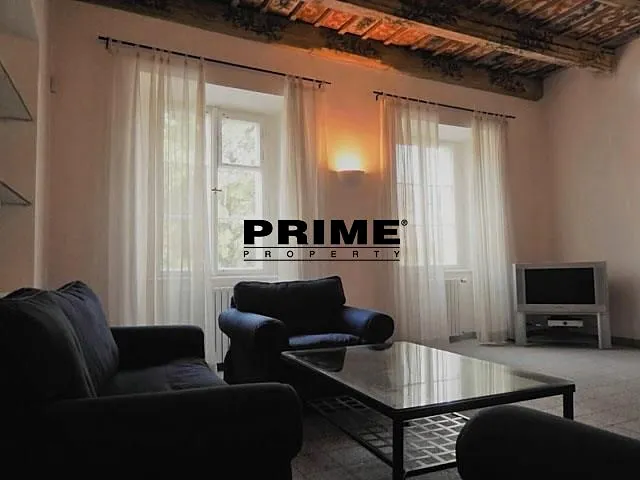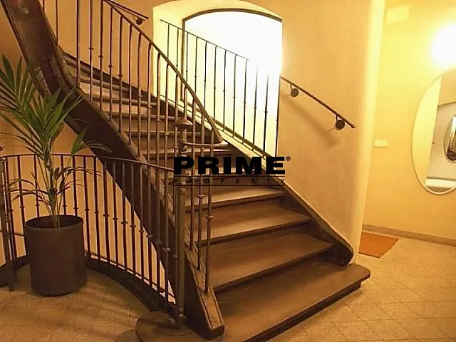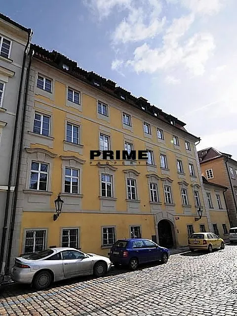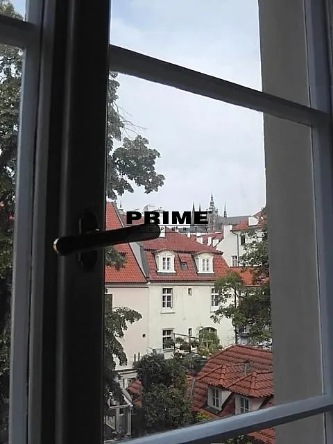 Z bytu je výhled na Pražský hrad a Čertovku. Dispozice bytu: obývací pokoj s krbem a barokním dřevěným malovaným stropem a s jídelní částí, samostatná, plně vybavená malá kuchyň se spotřebiči (sklokeramická varná deska, trouba, myčka, lednice a mrazák), ložnice s vlastní koupelnou (s hlubokou vanou/bazénkem, umyvadlem, toaletou a bidetem), druhá ložnice a druhá koupelna (se sprchovým koutem, umyvadlem, toaletou a bidetem).