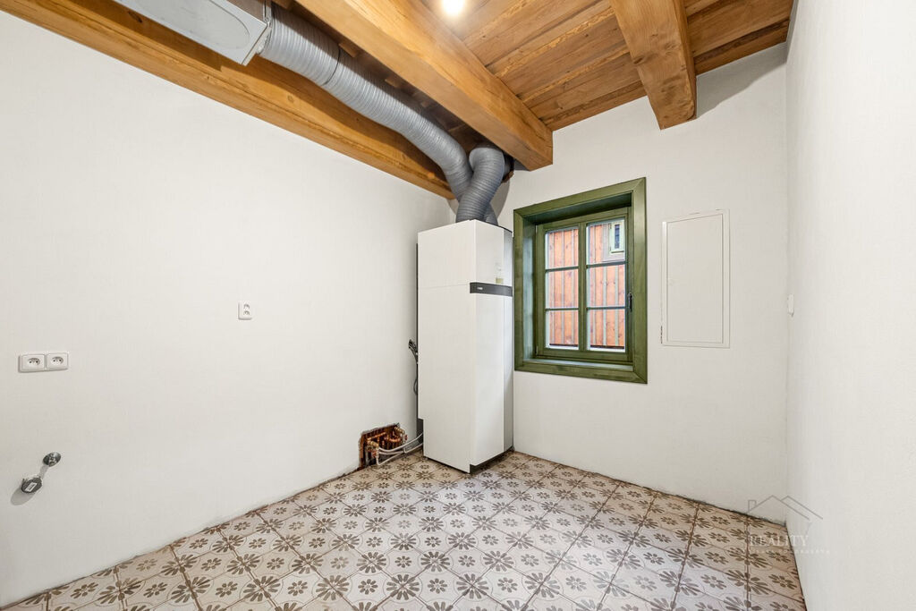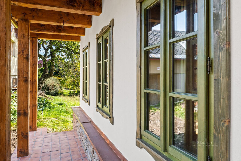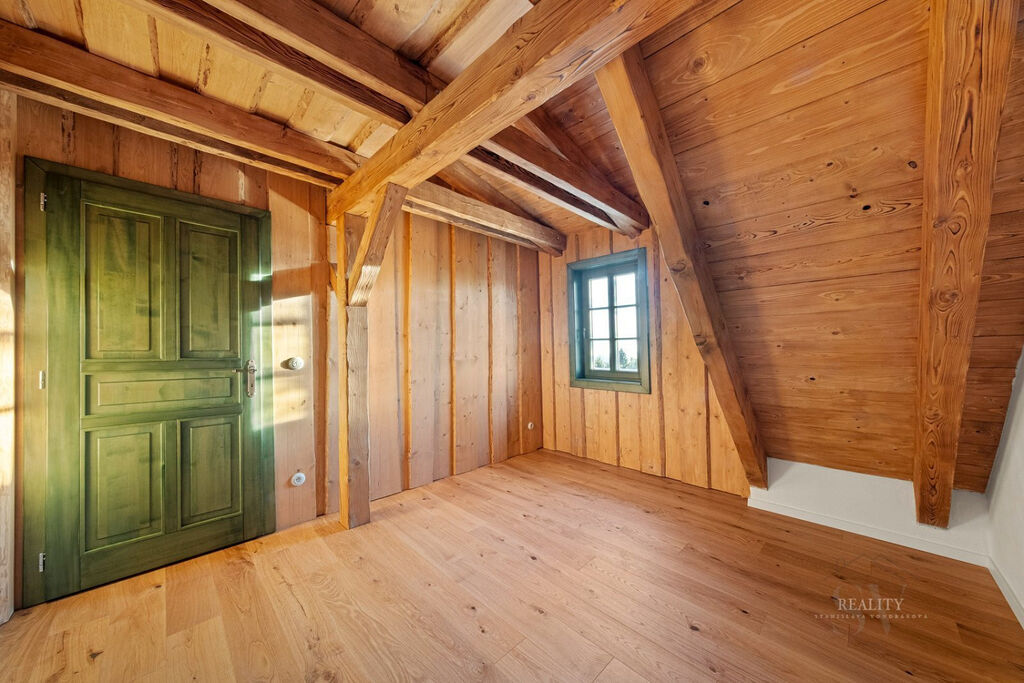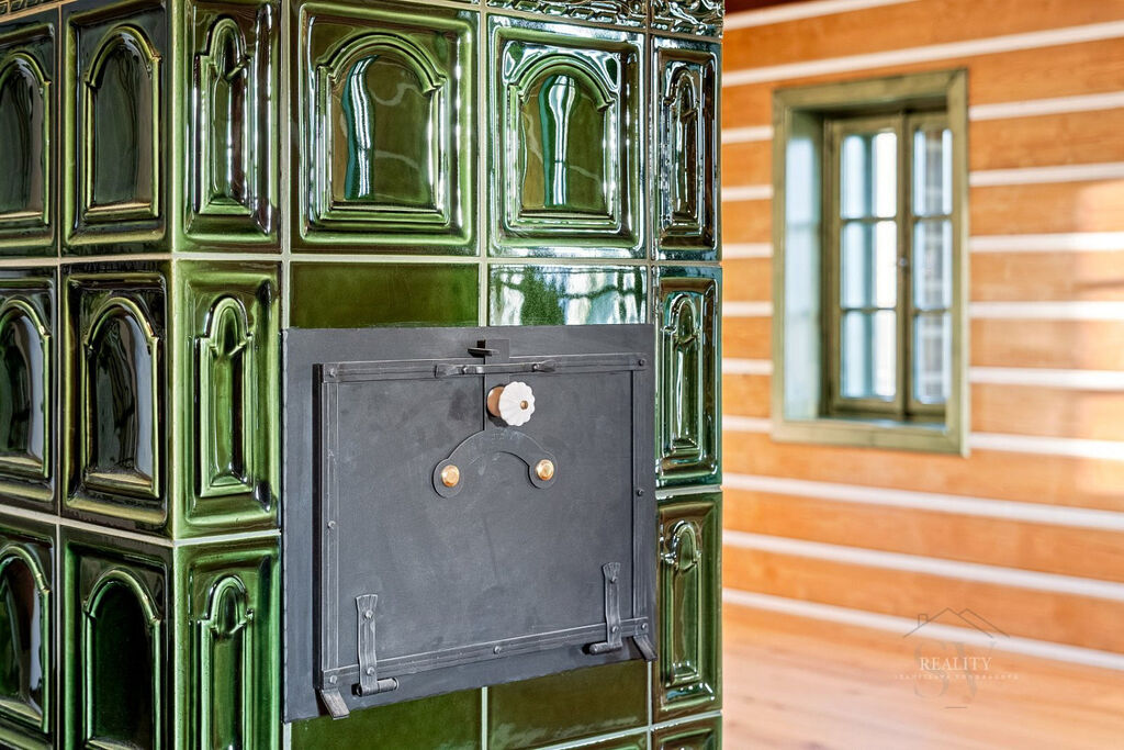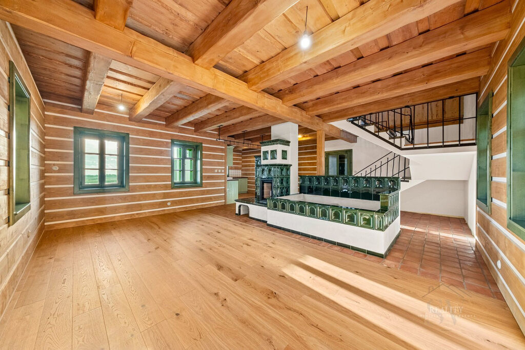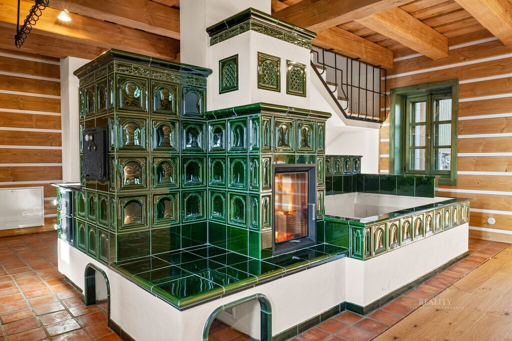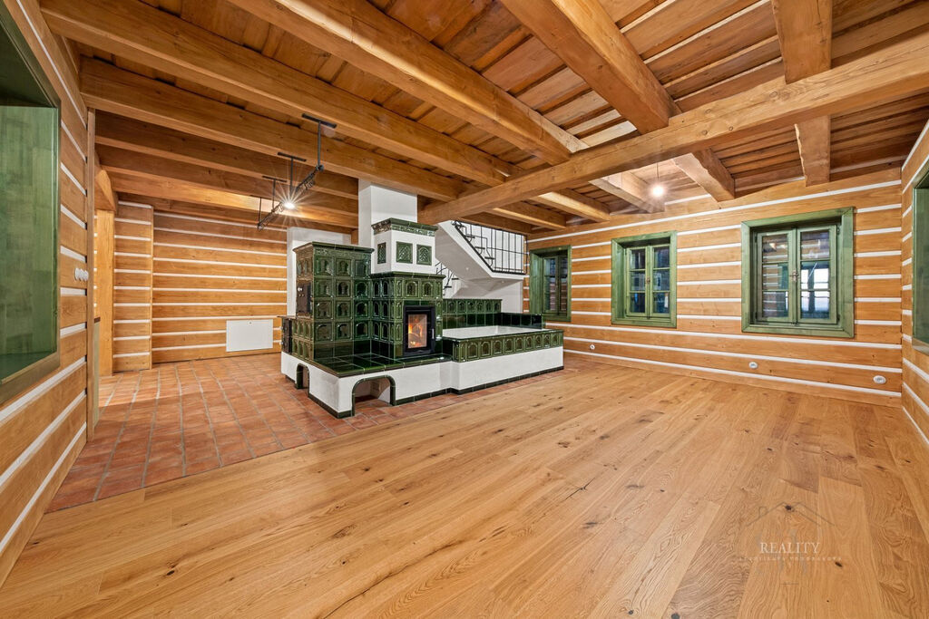 Ruční trámové prvky • kachlová kamna s ležením (6 kW) • tepelné čerpadlo NIBE S735-7 s rekuperací • dokončeno