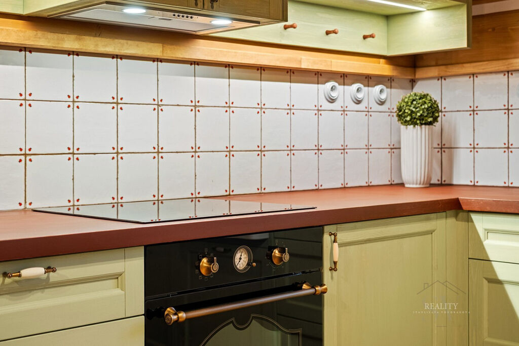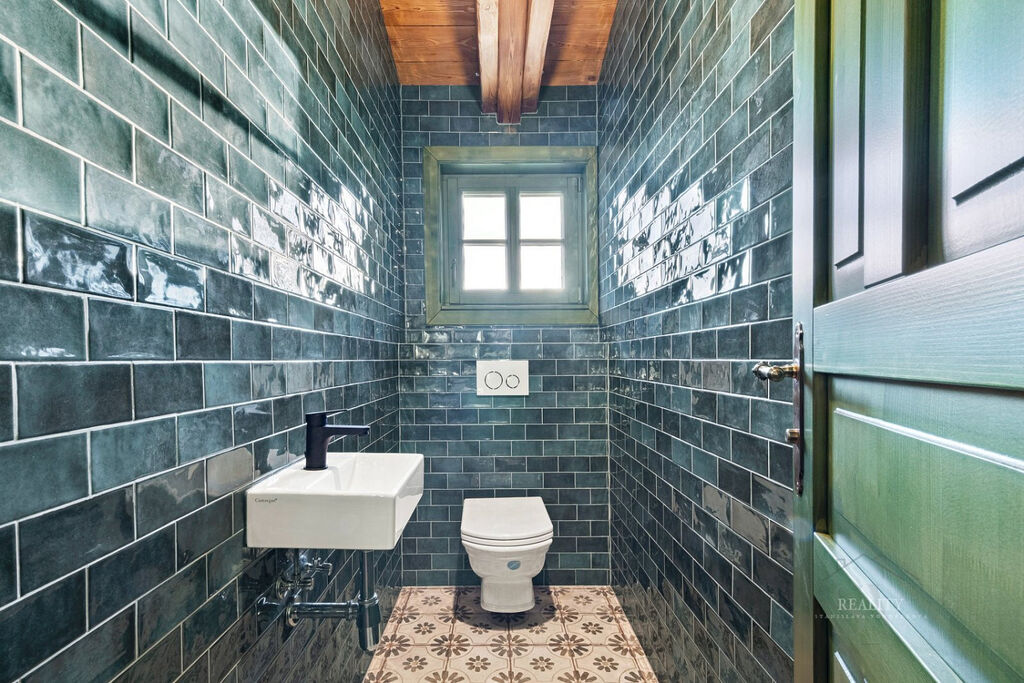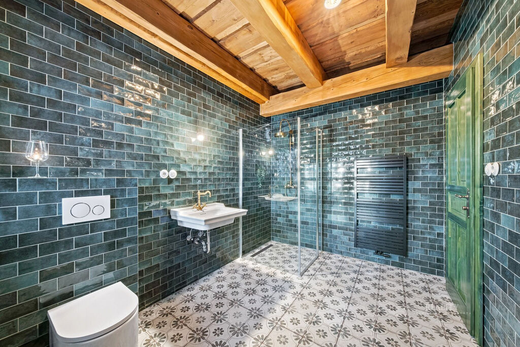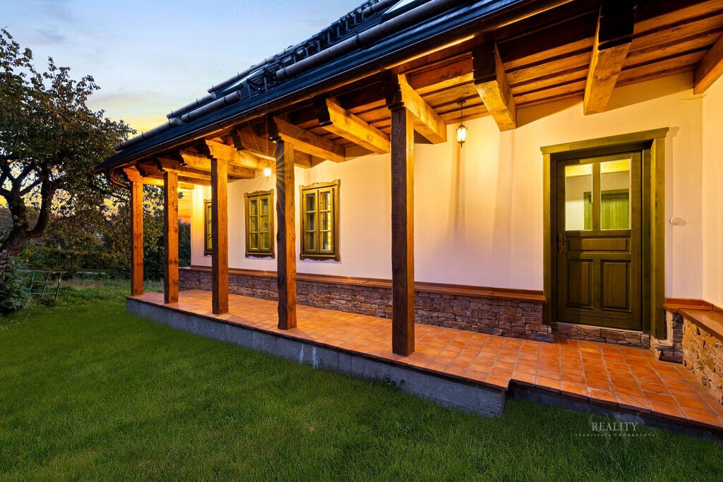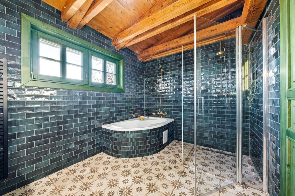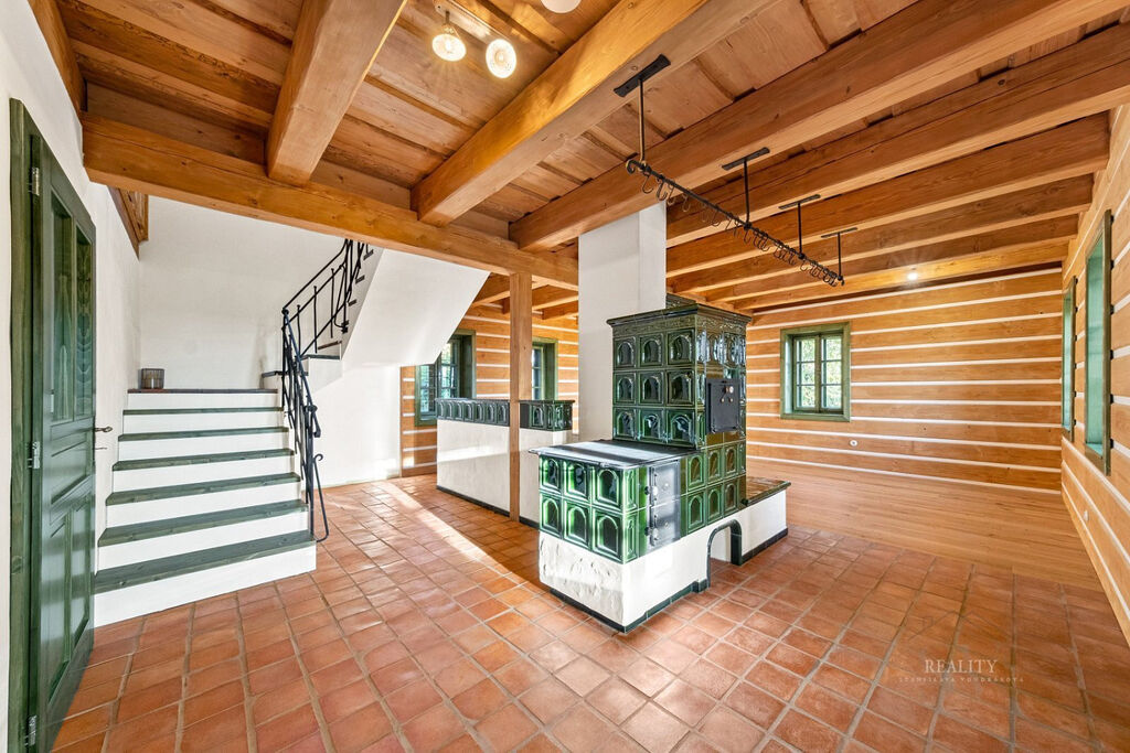 Interiér je promyšlen do posledního detailu – masivní dřevo, ručně malované obklady a precizní kovářská práce tvoří nadčasový celek. Kuchyň na míru a společenská zóna s kamny jsou srdcem domu: krásné na pohled, funkční v každodenním provozu.